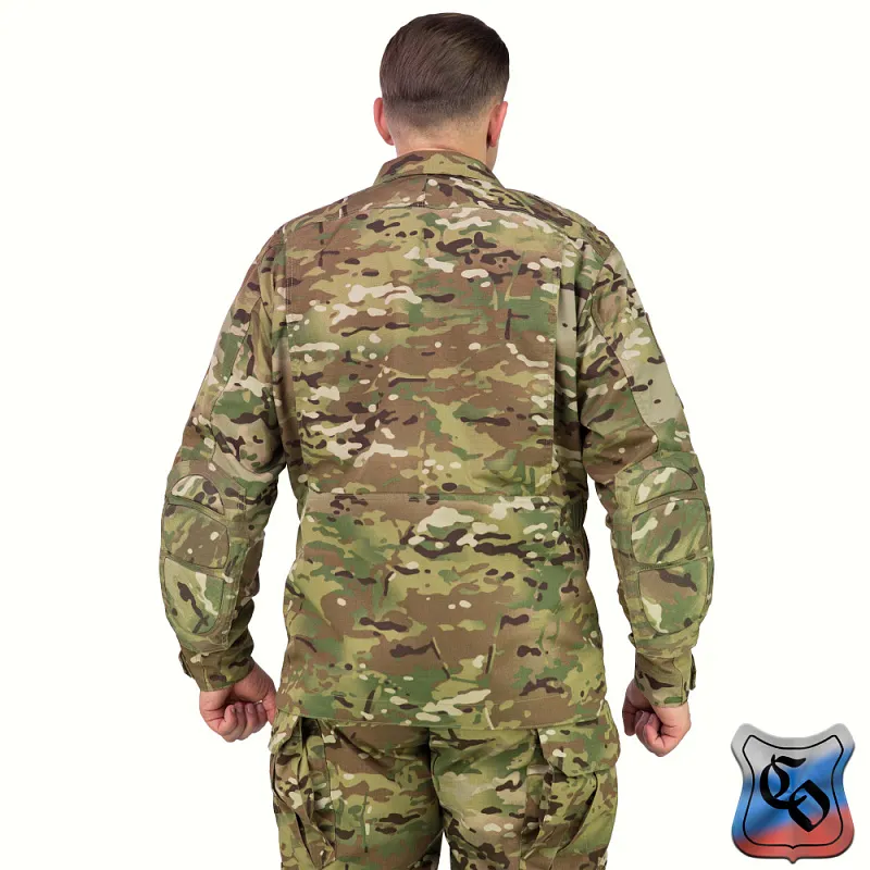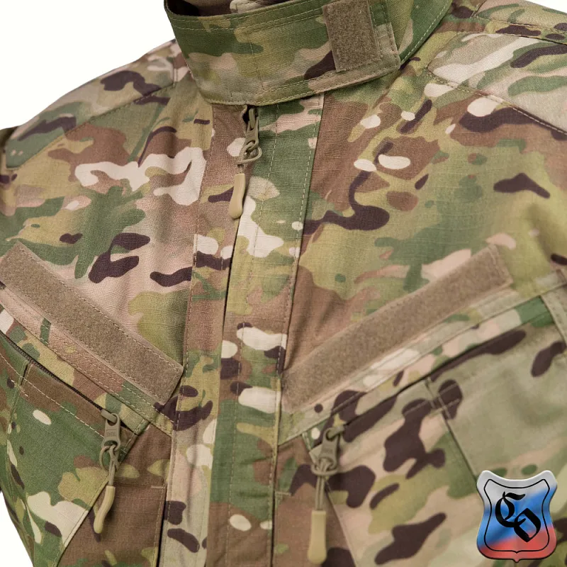Боевая куртка, удлиненная сзади и укороченная спереди для комфорта носки со стоячим воротником-стойкой, застегивающимся на липучку, что защищает шею от натирания ружейным ремнём, горловиной бронежилета или поддерживающими пояс лямками.