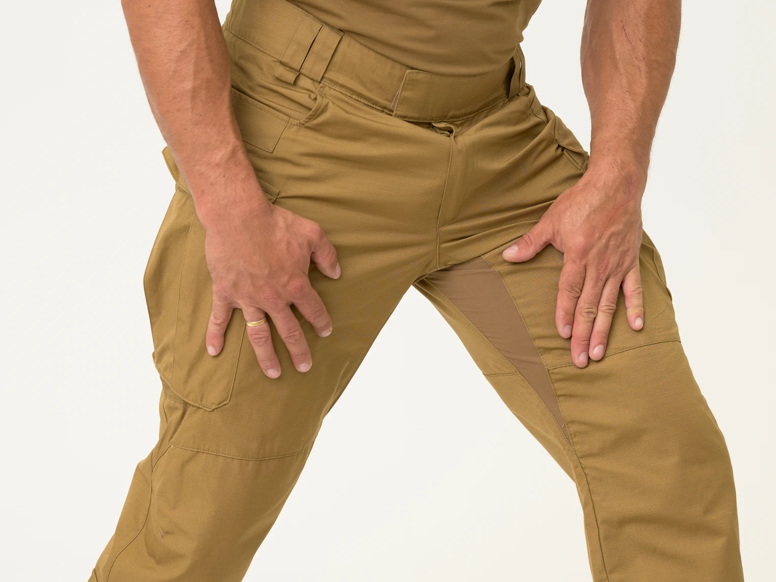 - Усиление коленей. Повышенная износостойкость при частом вставании на колени и движении по неровной местности. Для улучшения защиты коленей брюки также оснащены отделениями для вставок с наколенниками.