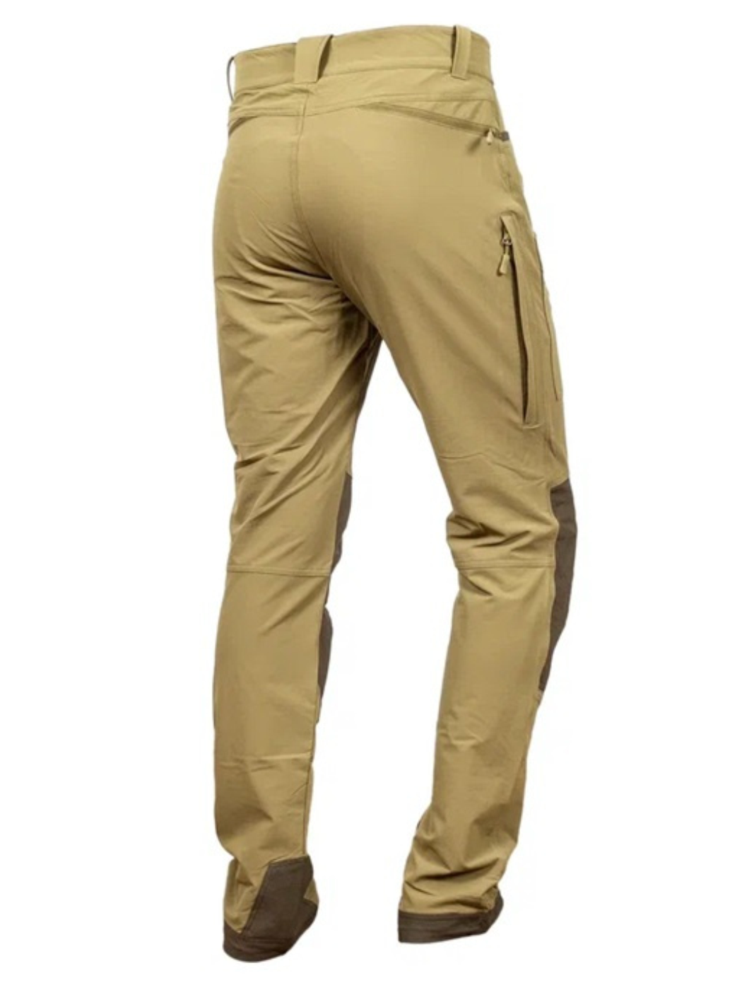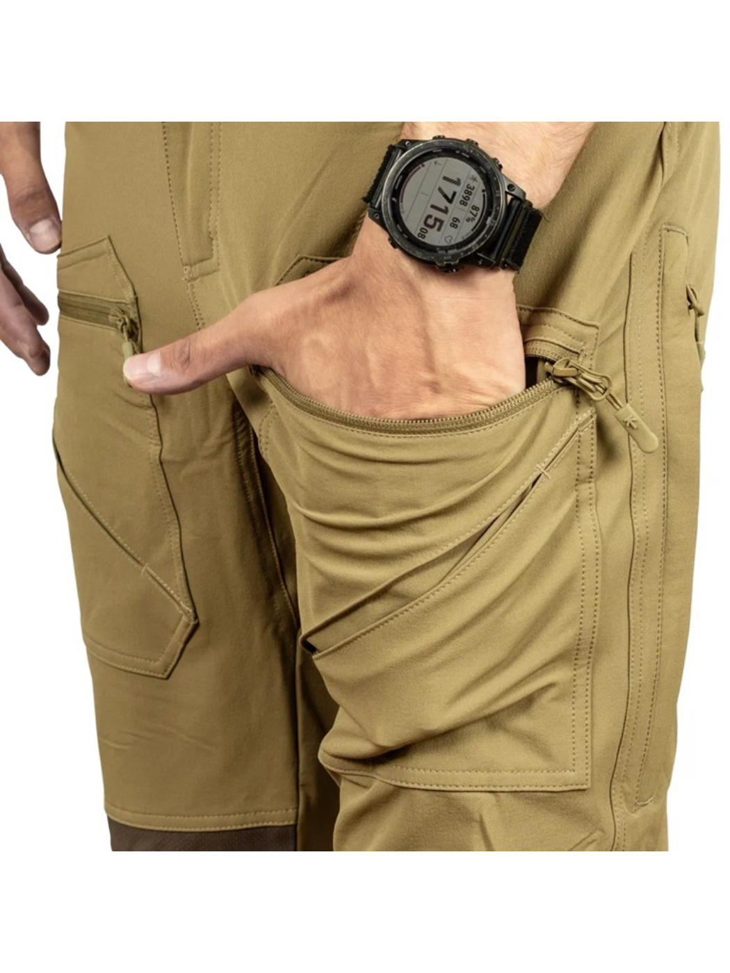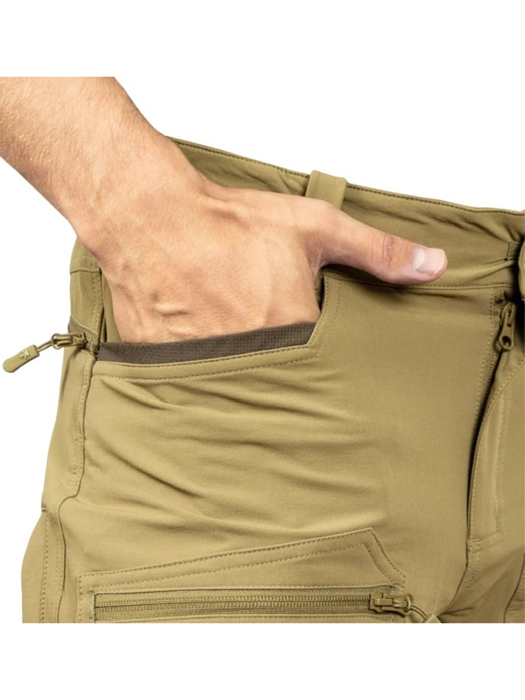 Низкопрофильные набедренные карманы выполнены накладными, закрываются на молнию, и предназначены, для документов или других плоских предметов, необъемных аксессуаров. Боковые карманы с прямым усиленным устьем, тыльные карманы на молнии. Усиненные вставки из нейлона 480D с PU покрытием в области коленей и в области лодыжек с внутренней стороны. Низ брюк фиксируется к шнуркам обуви для предотвращения его задирания крючком на эластичном ходу.