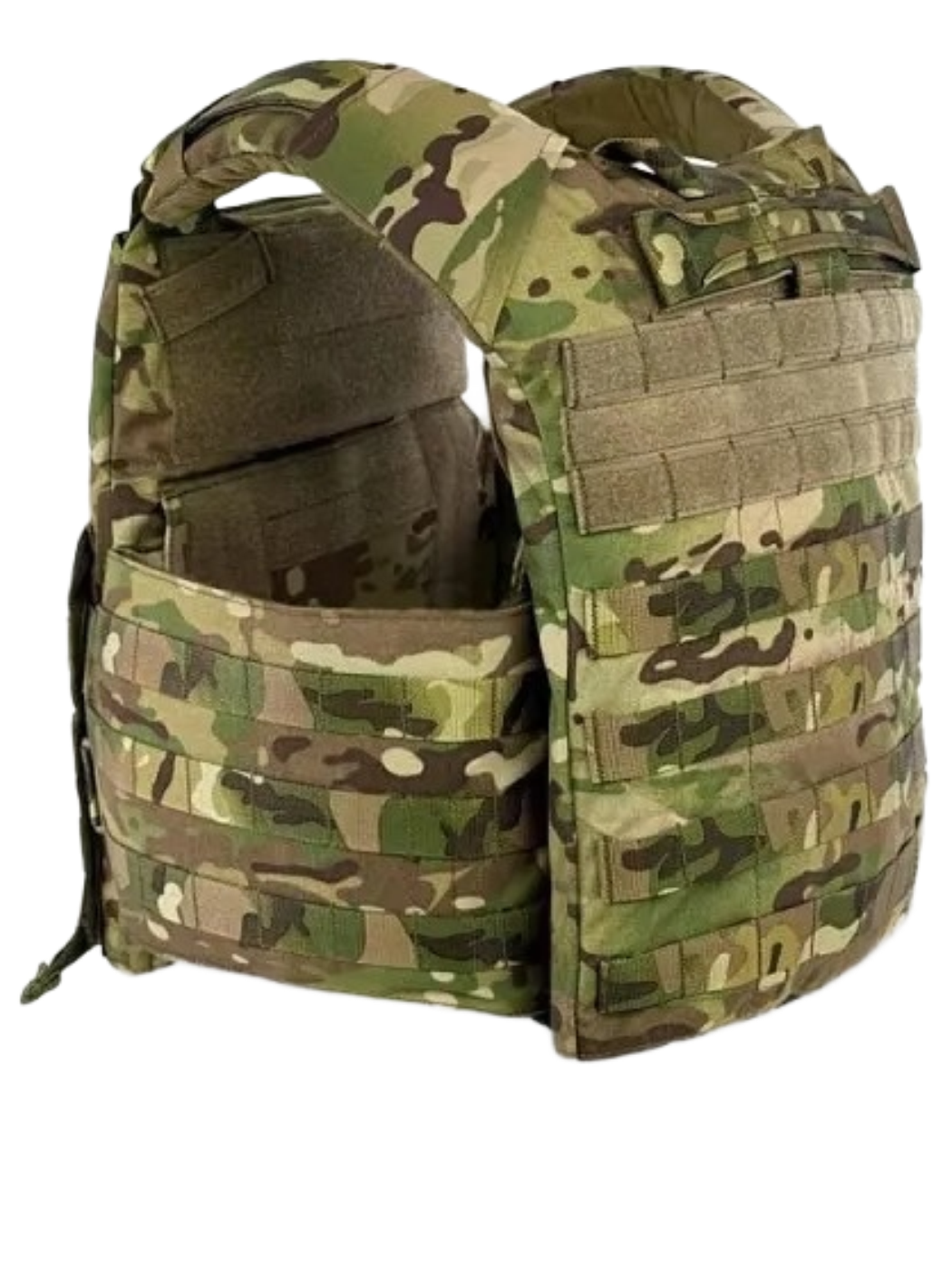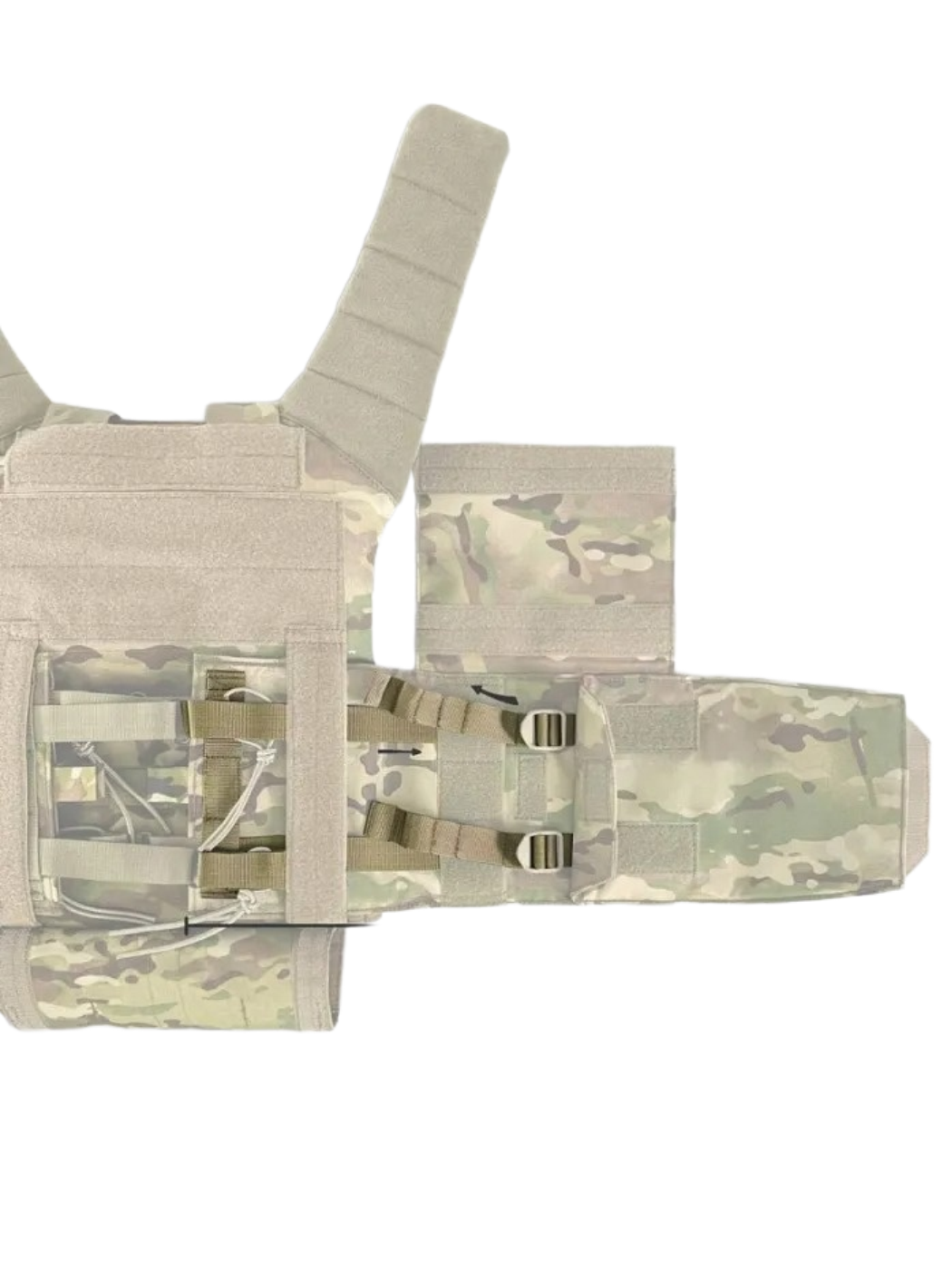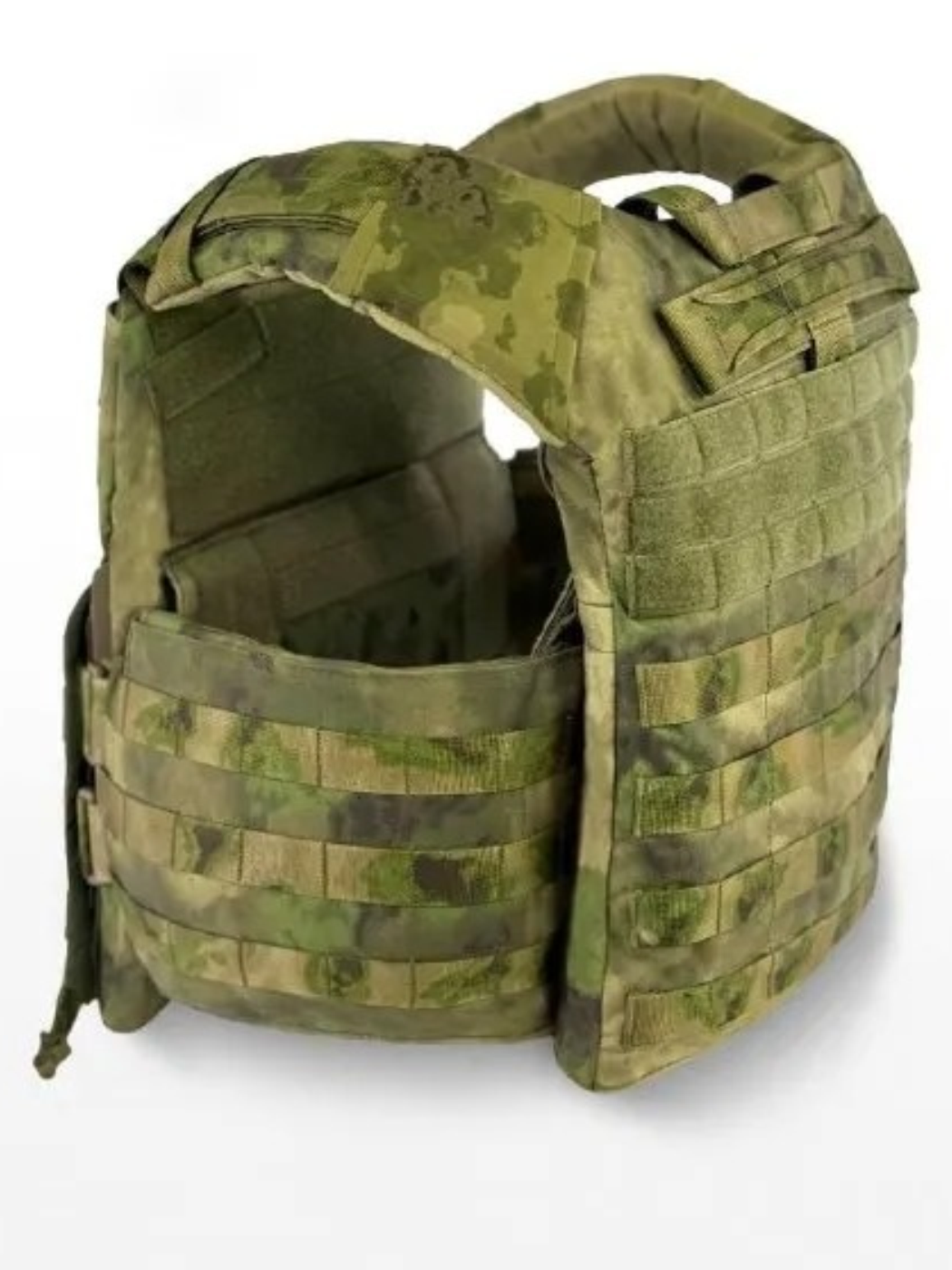 •Чтобы обеспечить максимальную область защиты от осколков, в плечевых лямках возможно размещение арамидного или СВМПЭ пакета. Также конструкция плечевых лямок позволяет зафиксировать на них защиту плеч. За счёт эргономичной формы, разноса лямок относительно друг друга, противоосколочные пакеты, как и в целом вес бронежилета не будут давить на плечи оператора.