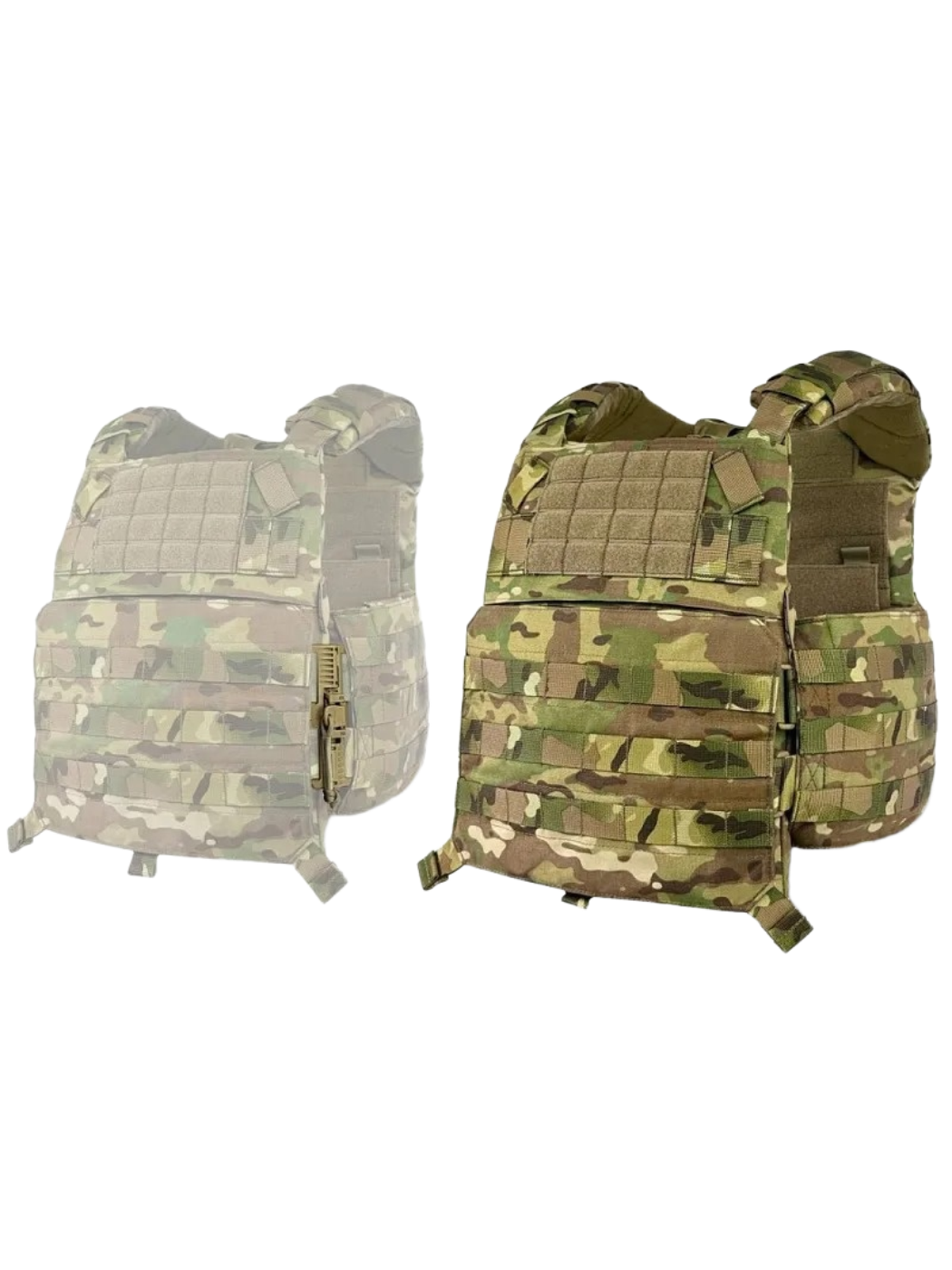 • Чехол состоит из передней и задней панели для размещения бронеплит и противорикошетных пакетов, регулирующихся по длине плечевых лямок, а также боковых поясных обхватов с отсеками для размещения мягкой противоосколочной защиты.