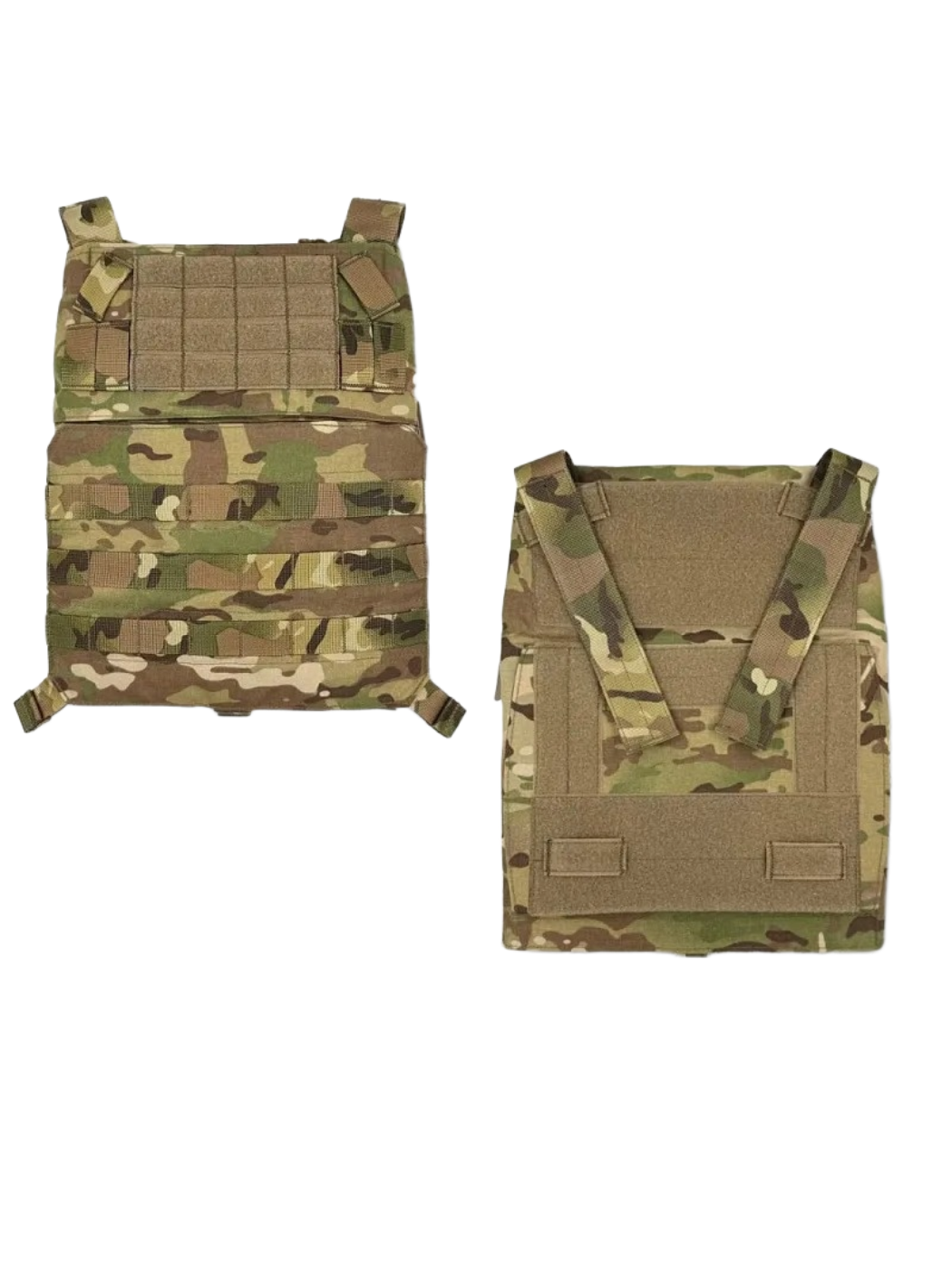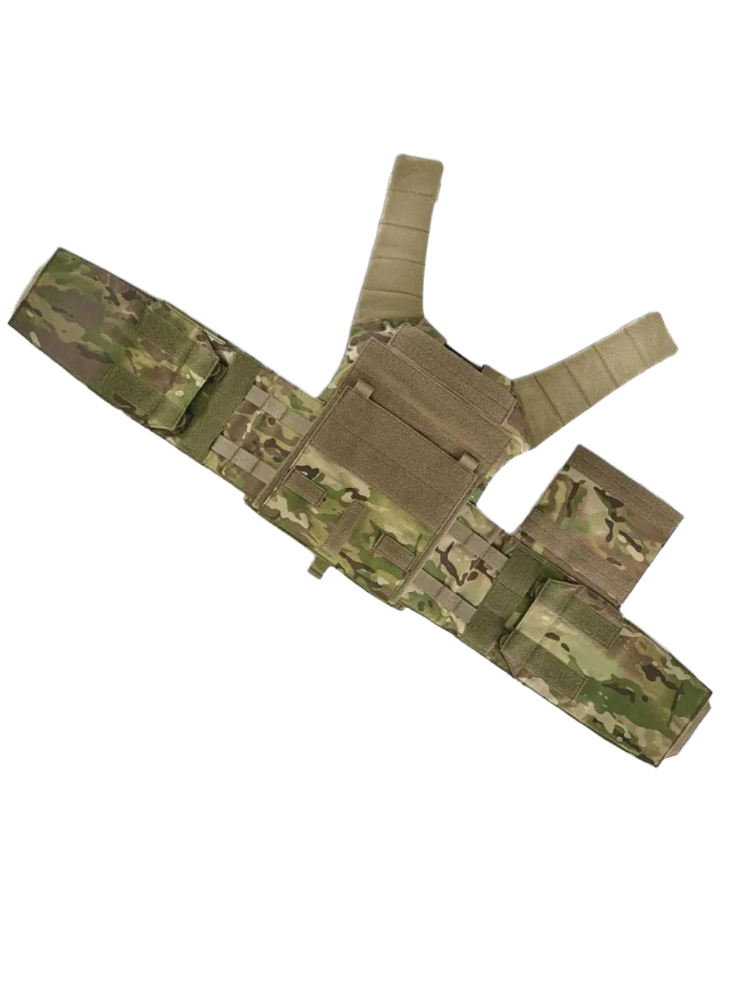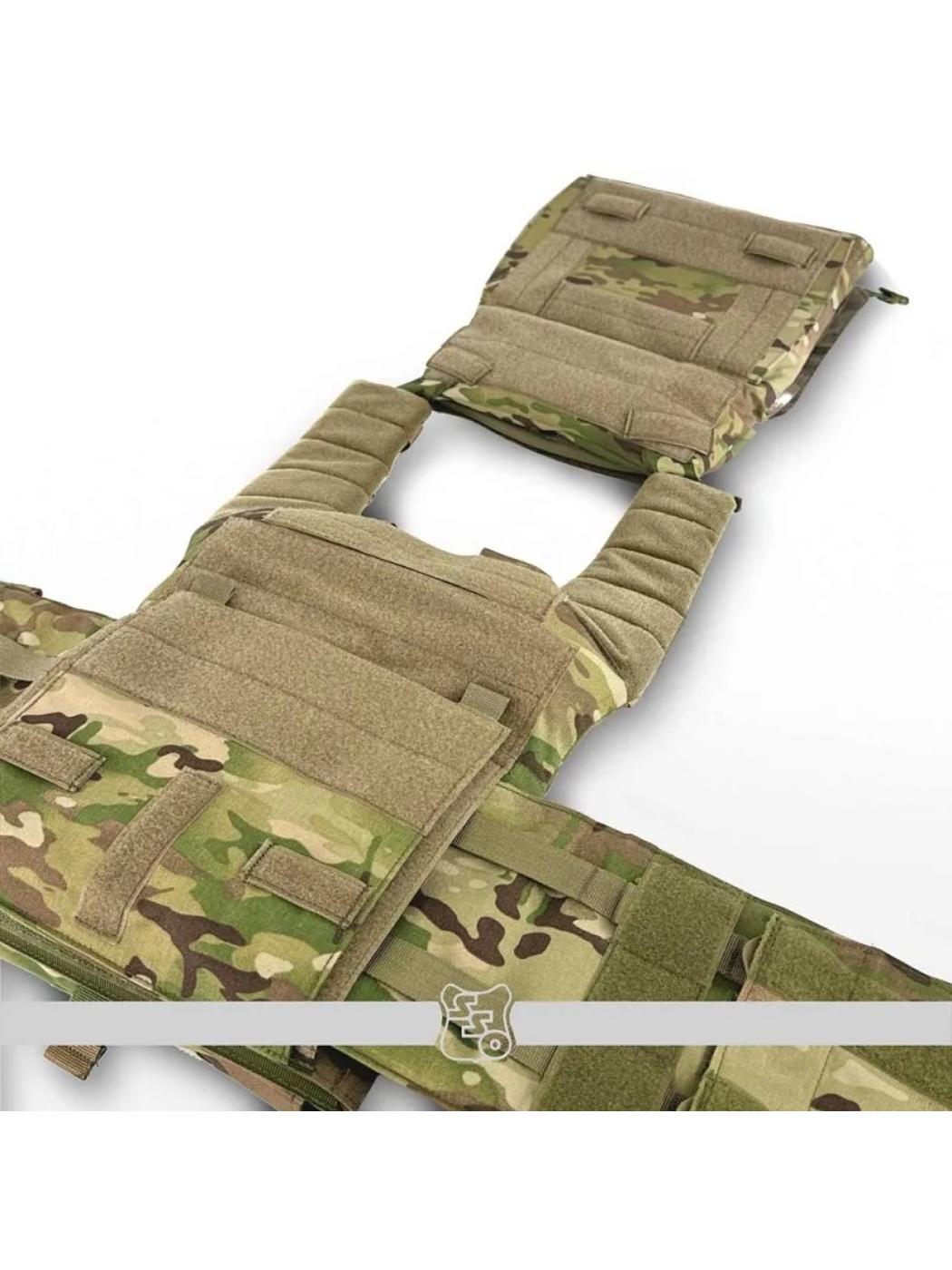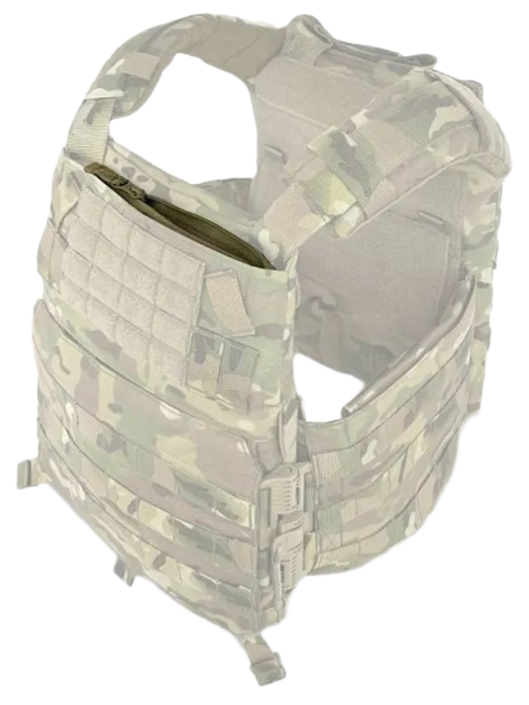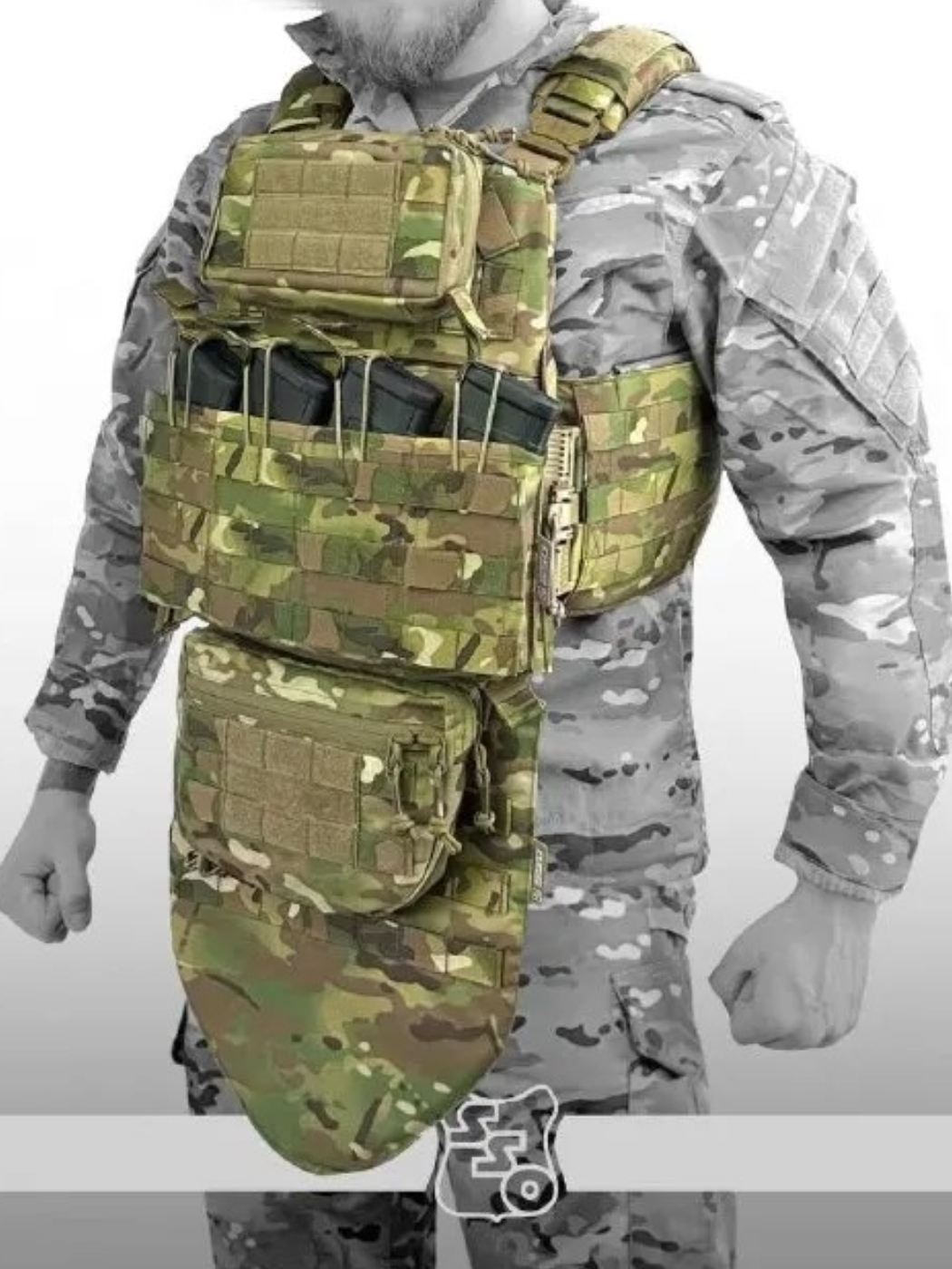 - Под передней панелью добавлен сквозной карман на липе для размещения защиты паха/абдоминального модуля/другого снаряжения, при этом передняя панель остается пустой и крепится теперь в этот же карман.