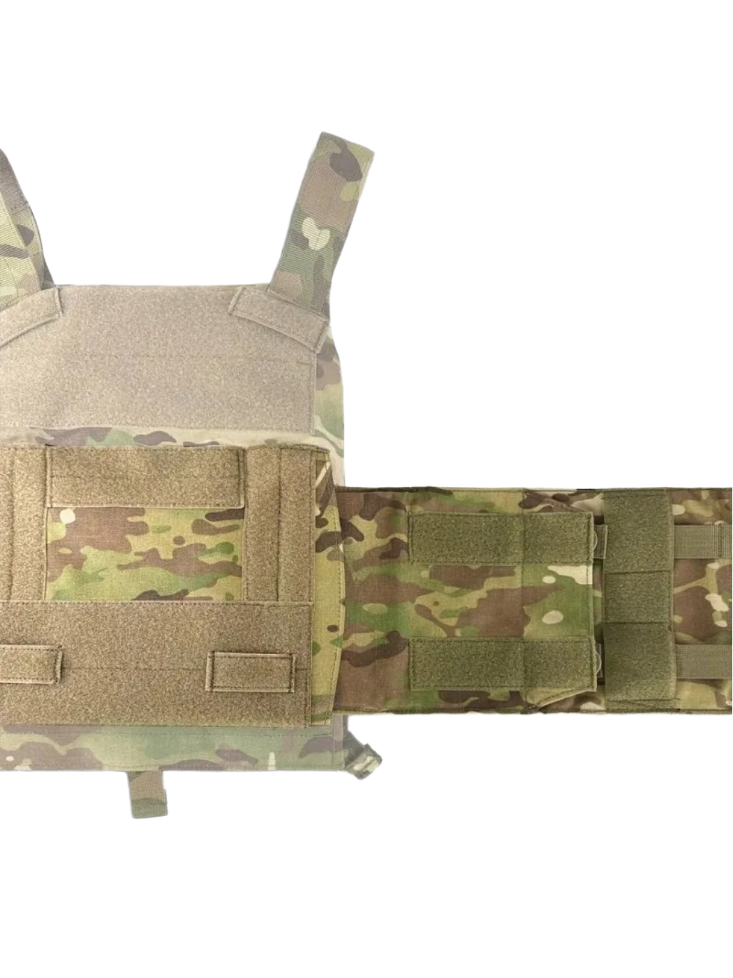 - Сделали эргономичный направляемый вход на переднем плейтбэге для хвоста камербанда, усиленный пластиком. Сместили его ближе к центру переднего плейтбэга для лучшей развесовки жилета.