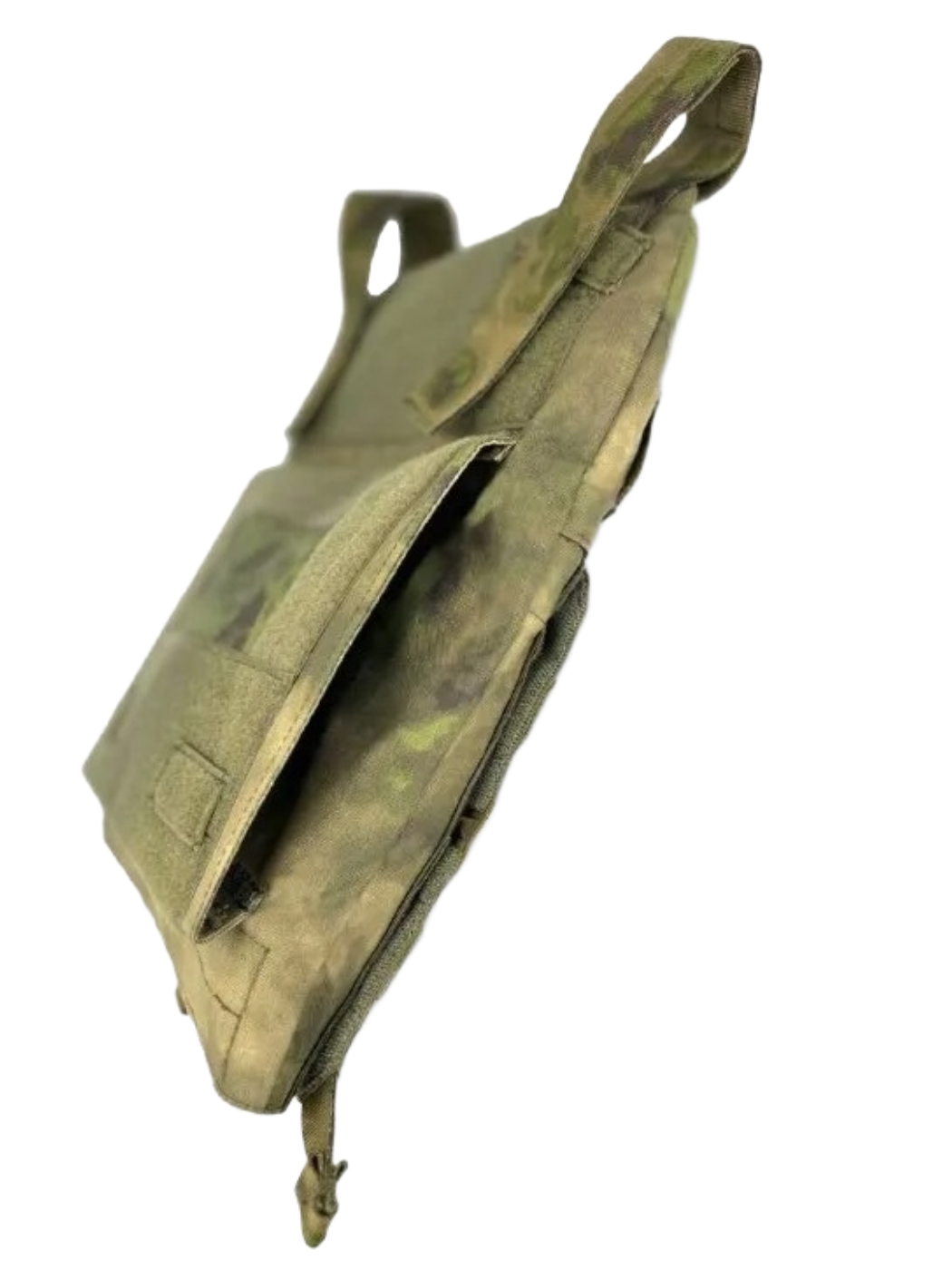 • Снаружи кармана расположены ячейки Molle для крепления дополнительного снаряжения. Поверх ячеек нашита липучка для размещения патчей и неймтапов.