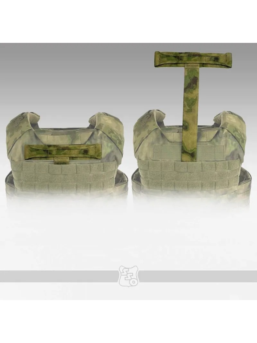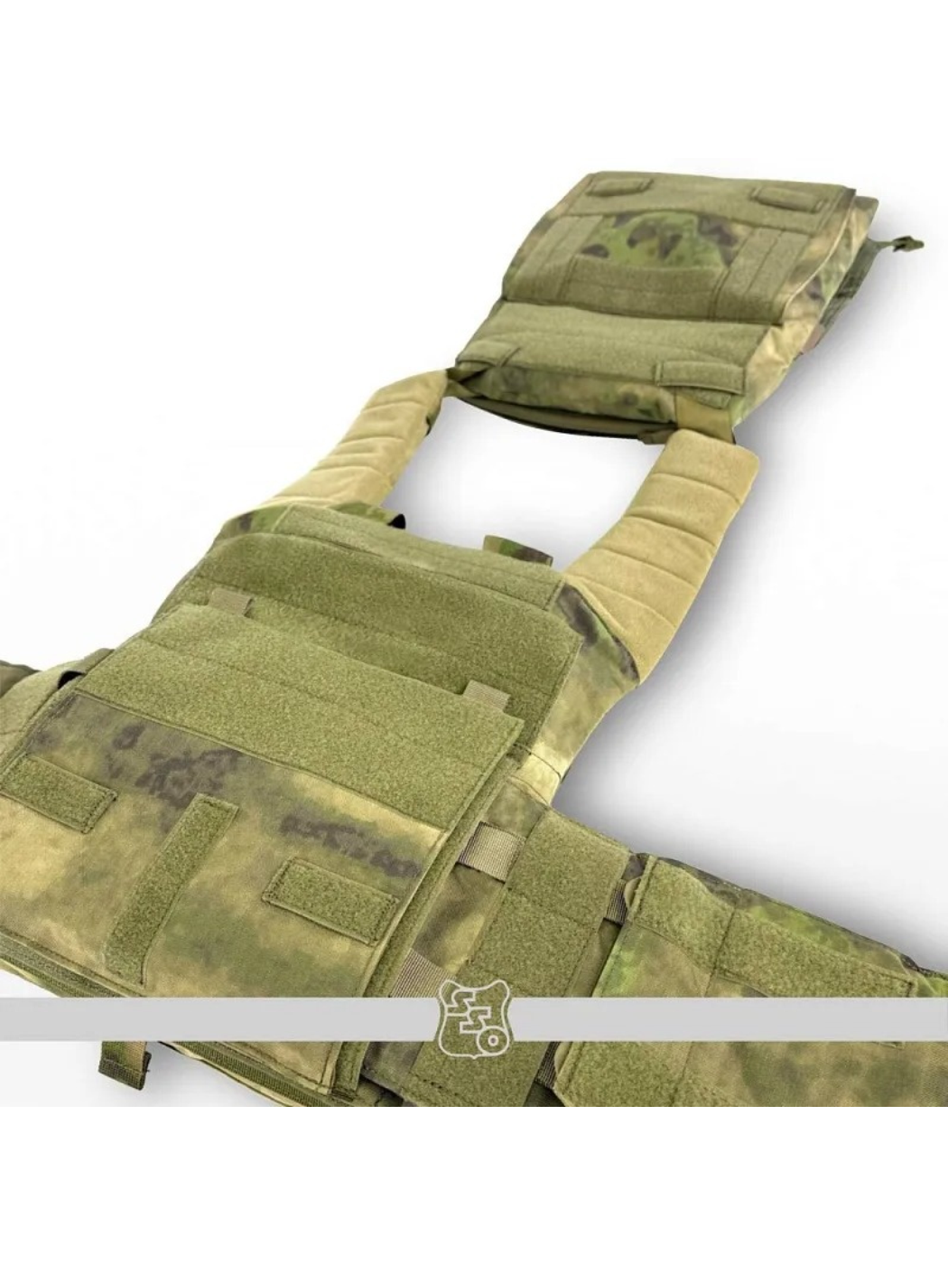 • На спине расположены: две эвакуационные петли, Molle ячейки для фиксации продовольственной сумки, чехла под гидросистему или штурмового рюкзака. Верхние три ряда ячеек покрыты липучкой для установки опознавательных знаков.