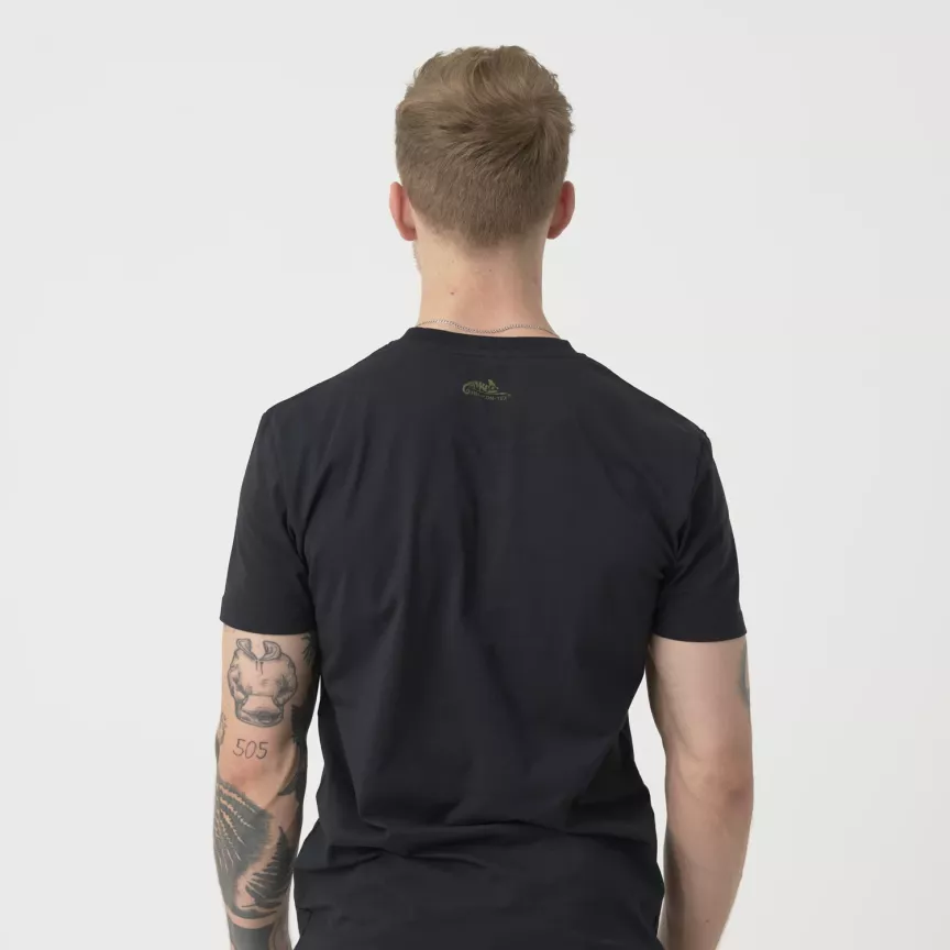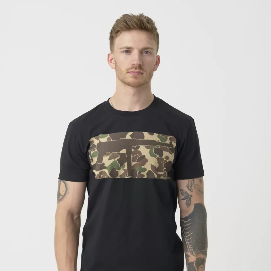 Классическая хлопковая футболка стандартного кроя. Винтовка на фоне камуфляжа Duck Hunter напоминают о военных корнях компании. Характерная форма футболок развилась в начале 20-го века из прежнего нижнего белья (известного как комбинезон). После Второй мировой войны хлопковые футболки в форме буквы Т стали очень популярны, отчасти благодаря Марлону Брандо и Джеймсу Дину, которые носили их на экране.