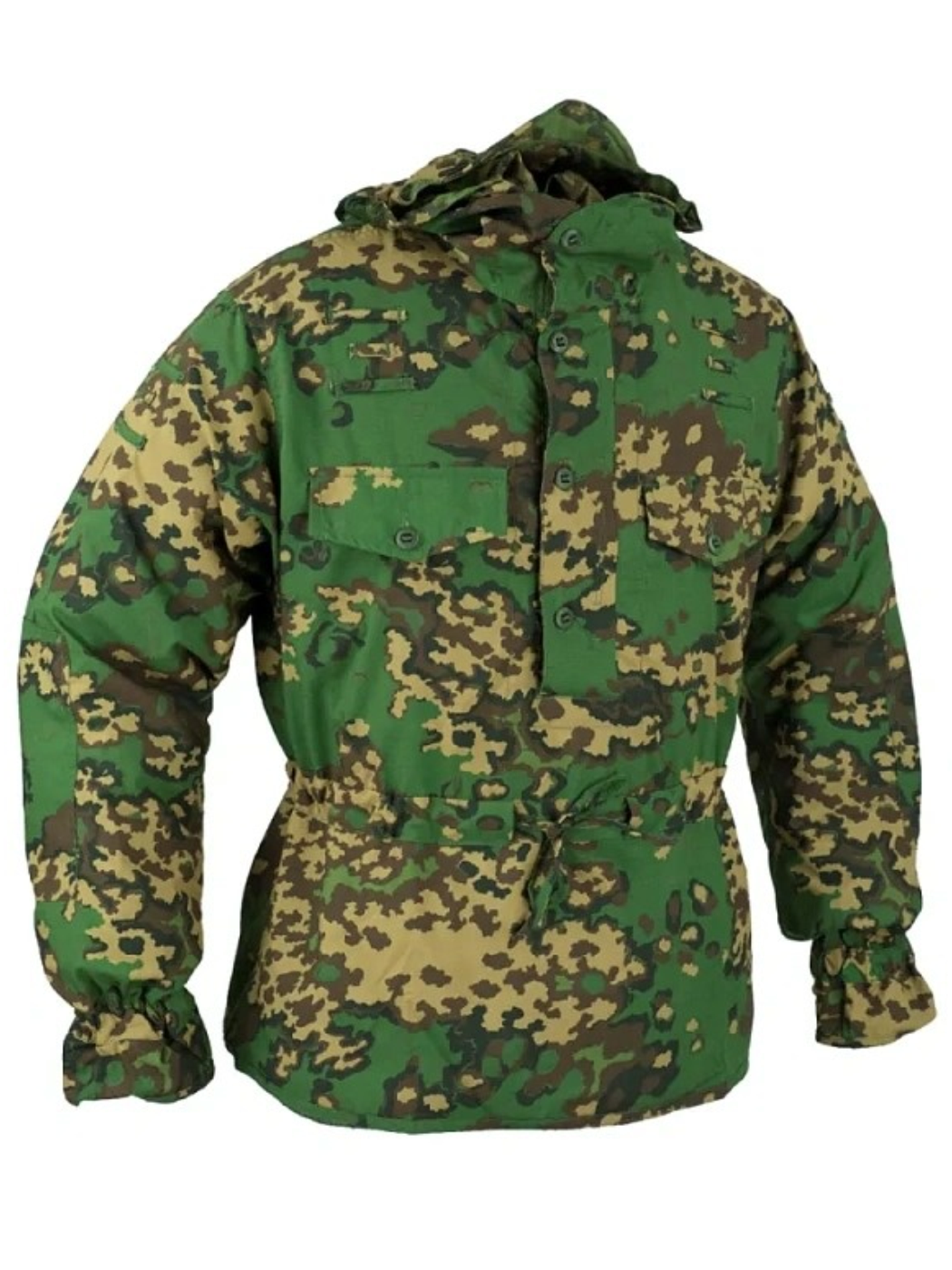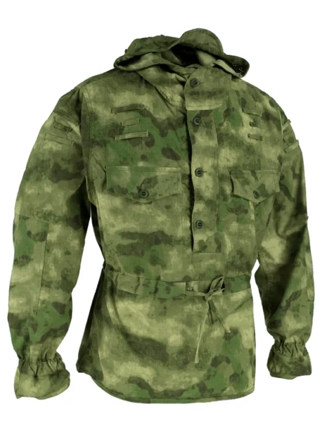 • Мешковатый силуэт куртки-анорак с капюшоном, а также отсутствие накладных карманов, в сочетании с контрастными цветами используемых рисунков камуфляжа обеспечивают низкую заметность бойца на местности.