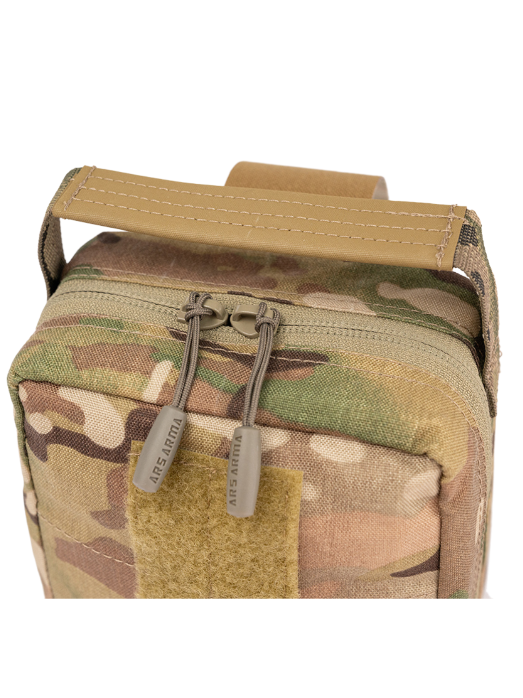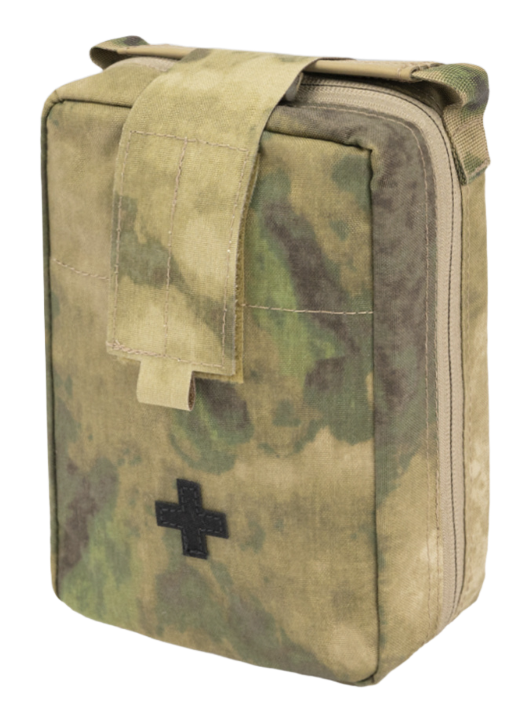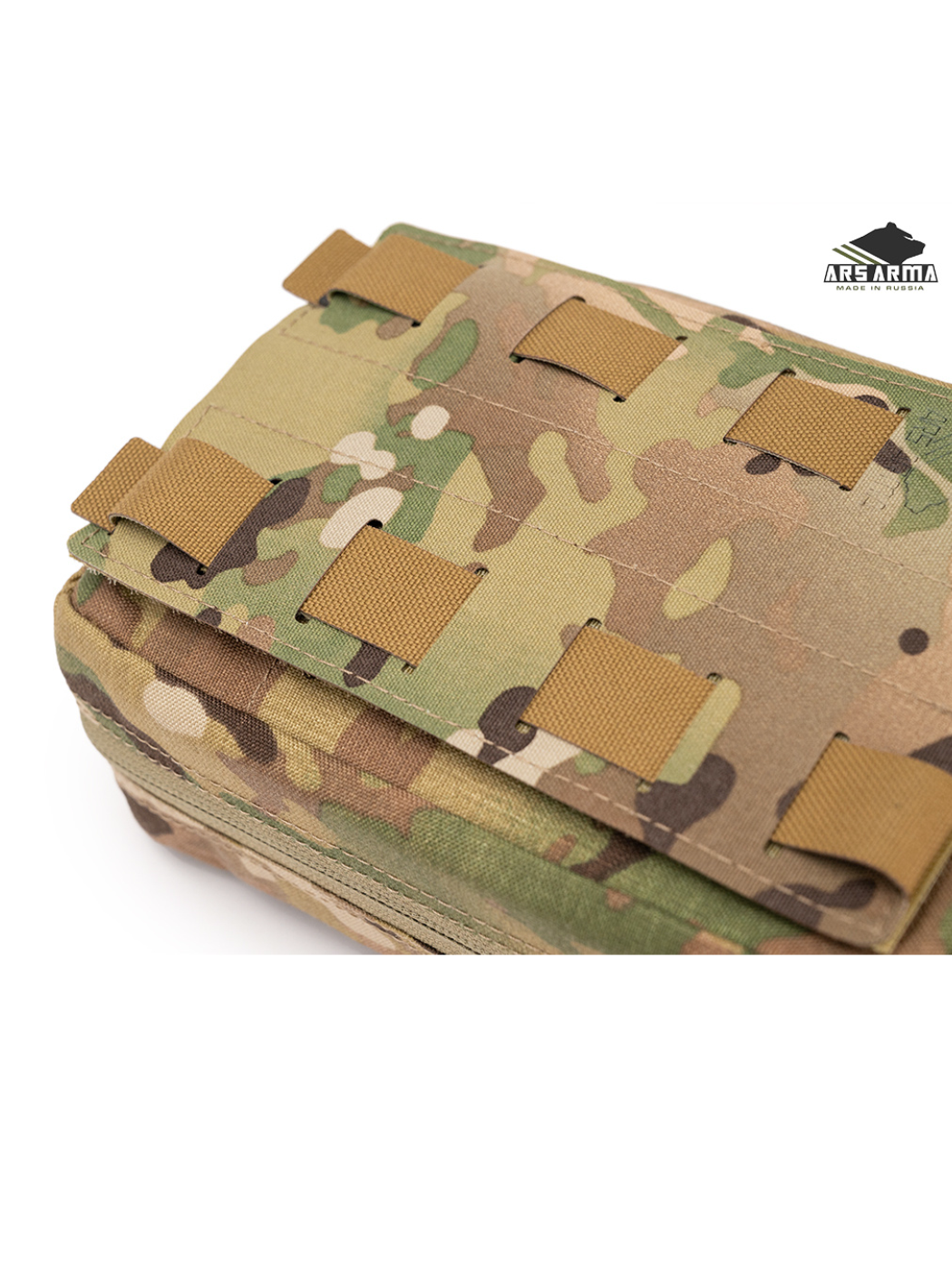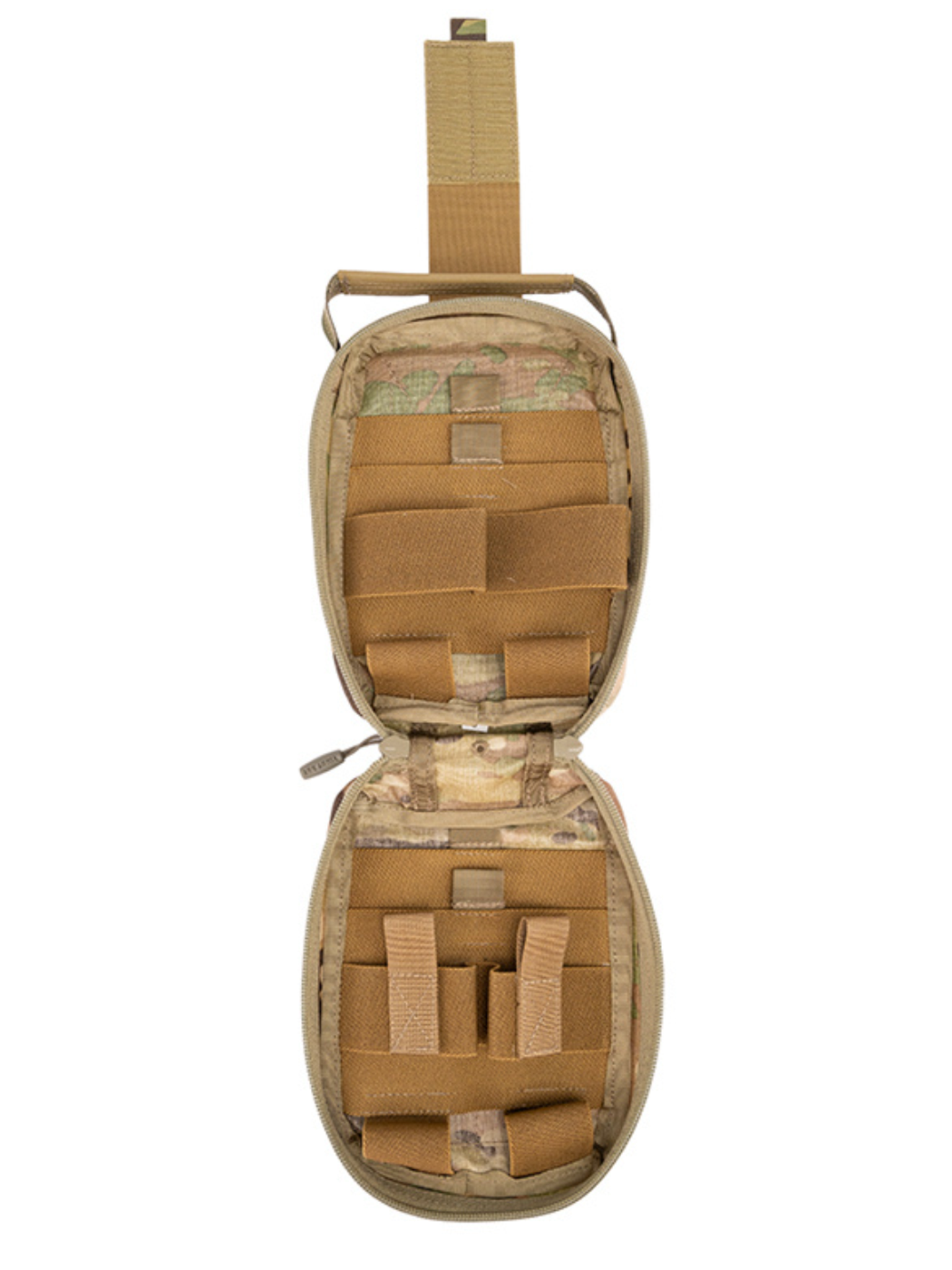Малая отрывная аптека. Подсумок имеет очень удобный органайзер с эластичными карманами, стропами и петлями для крепления всего необходимого медицинского инвентаря. Подсумок состоит из площадки и подсумка, который крепится к ней с помощью велкро и удерживается хлястиком с велкро. Сверху находится ручка за которую подсумок тянут чтобы отделить от велкро площадки, также ее можно использовать для переноски подсумка отдельно от MOLLE платформ. Благодаря велкро площадке подсумок можно крепить на другие совместимые велкро платформы, например в медицинских рюкзаках.