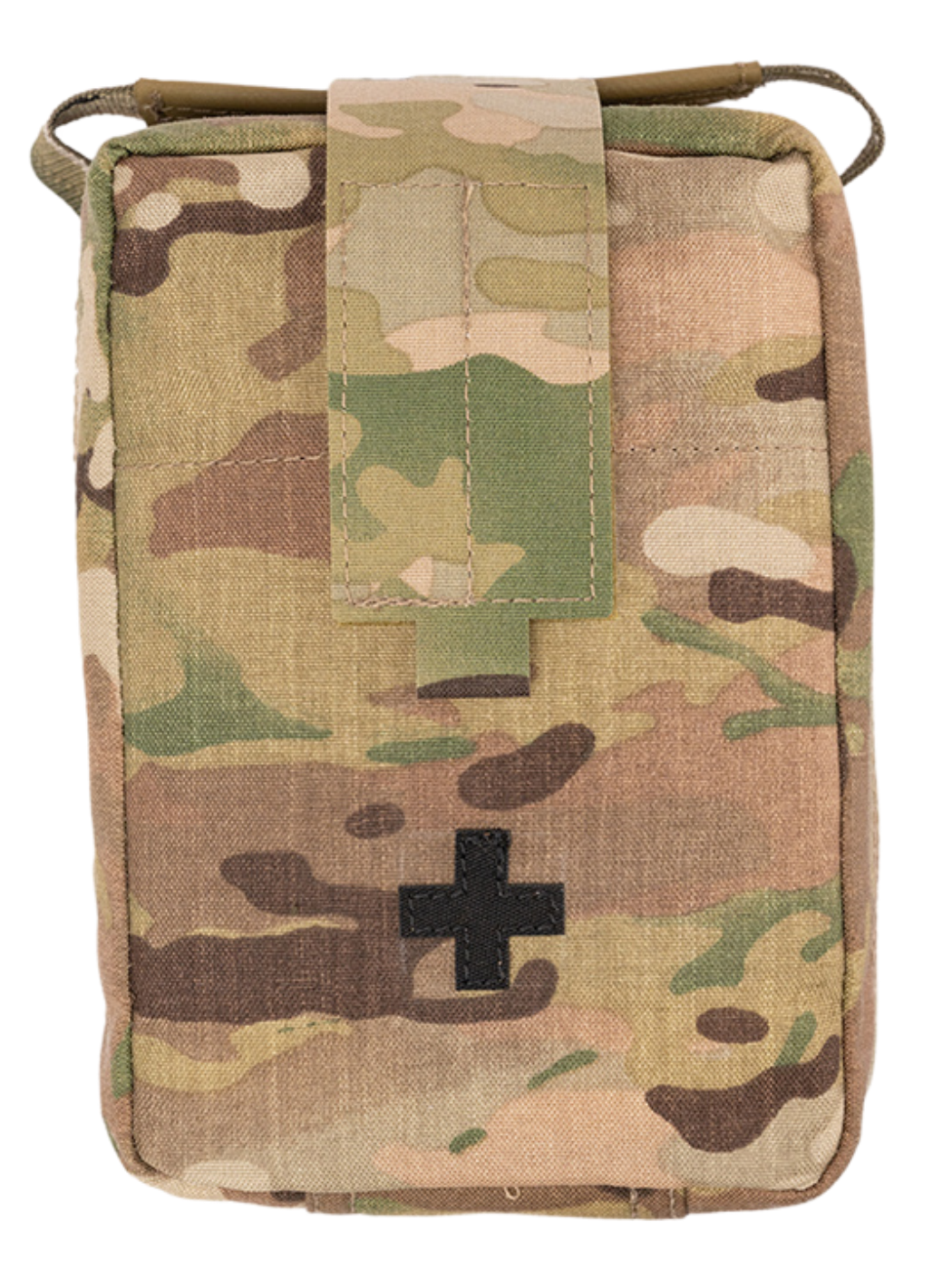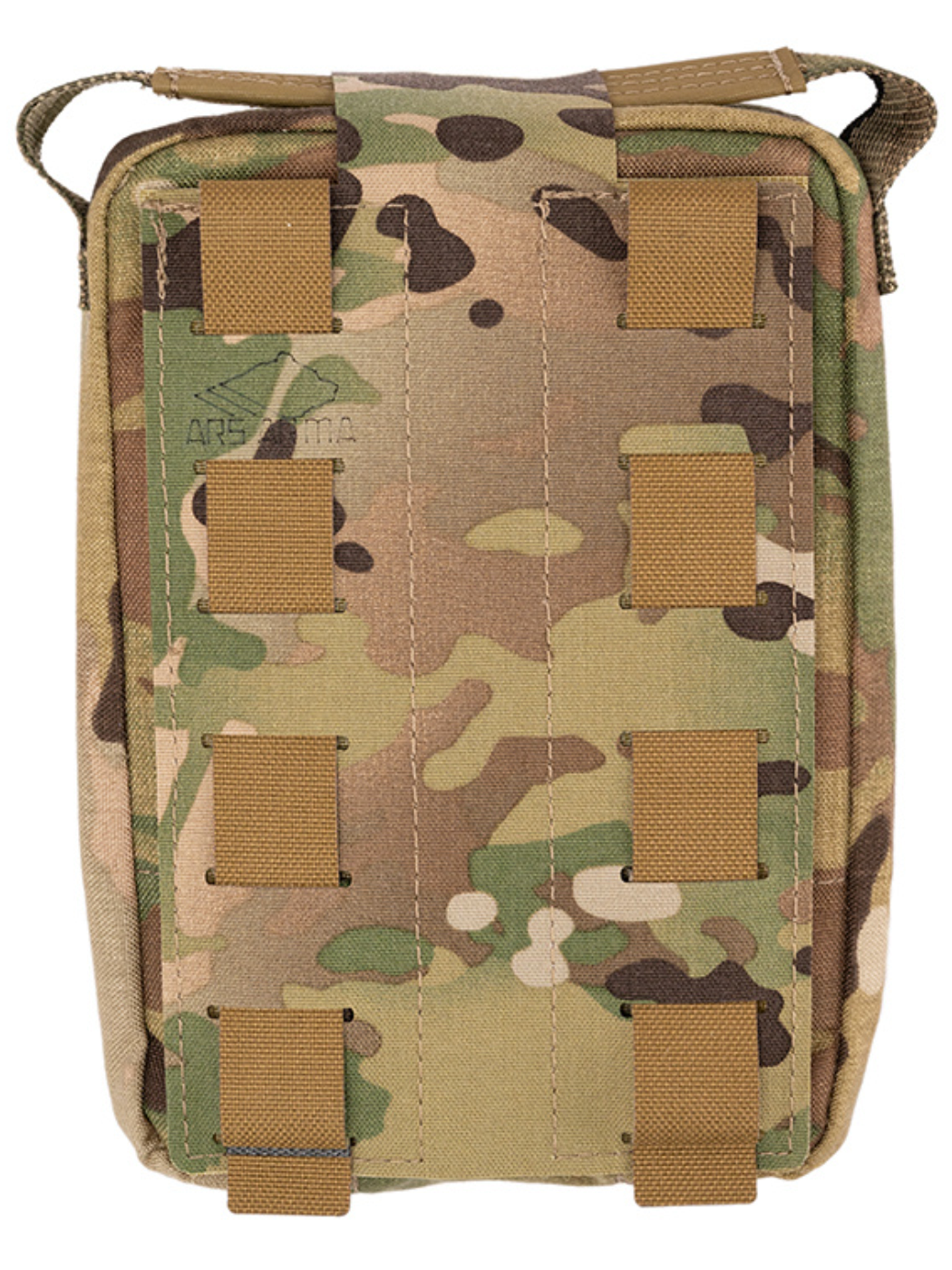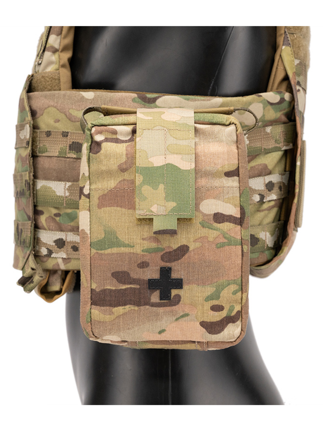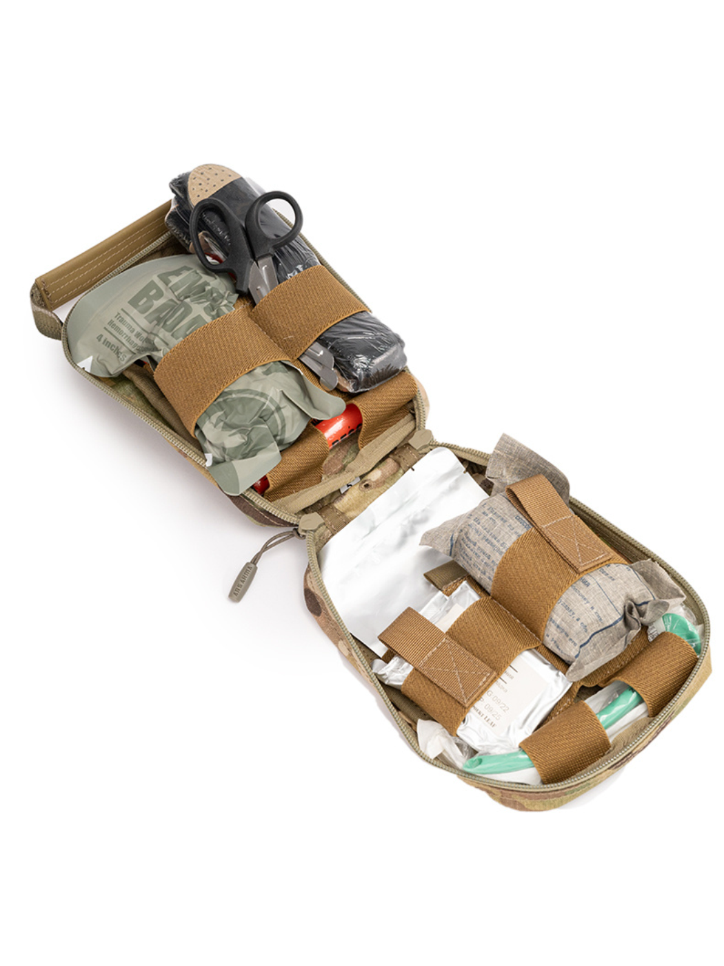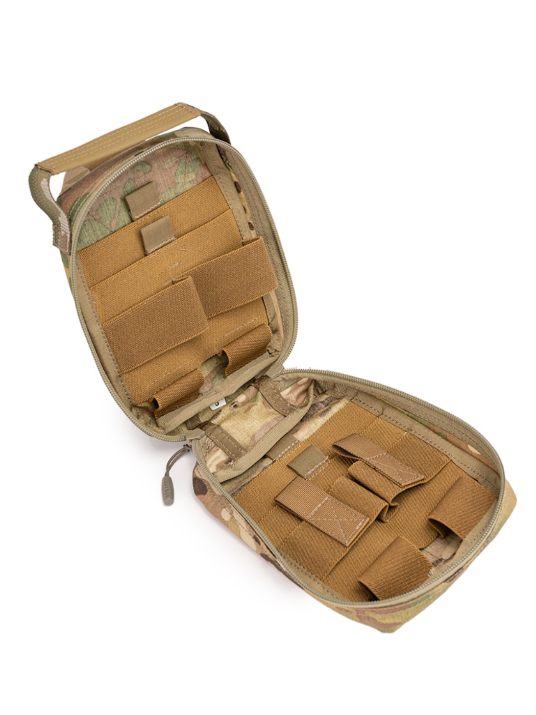 Малая отрывная аптека. Подсумок имеет очень удобный органайзер с эластичными карманами, стропами и петлями для крепления всего необходимого медицинского инвентаря. Подсумок состоит из площадки и подсумка, который крепится к ней с помощью велкро и удерживается хлястиком с велкро. Сверху находится ручка за которую подсумок тянут чтобы отделить от велкро площадки, также ее можно использовать для переноски подсумка отдельно от MOLLE платформ. Благодаря велкро площадке подсумок можно крепить на другие совместимые велкро платформы, например в медицинских рюкзаках.