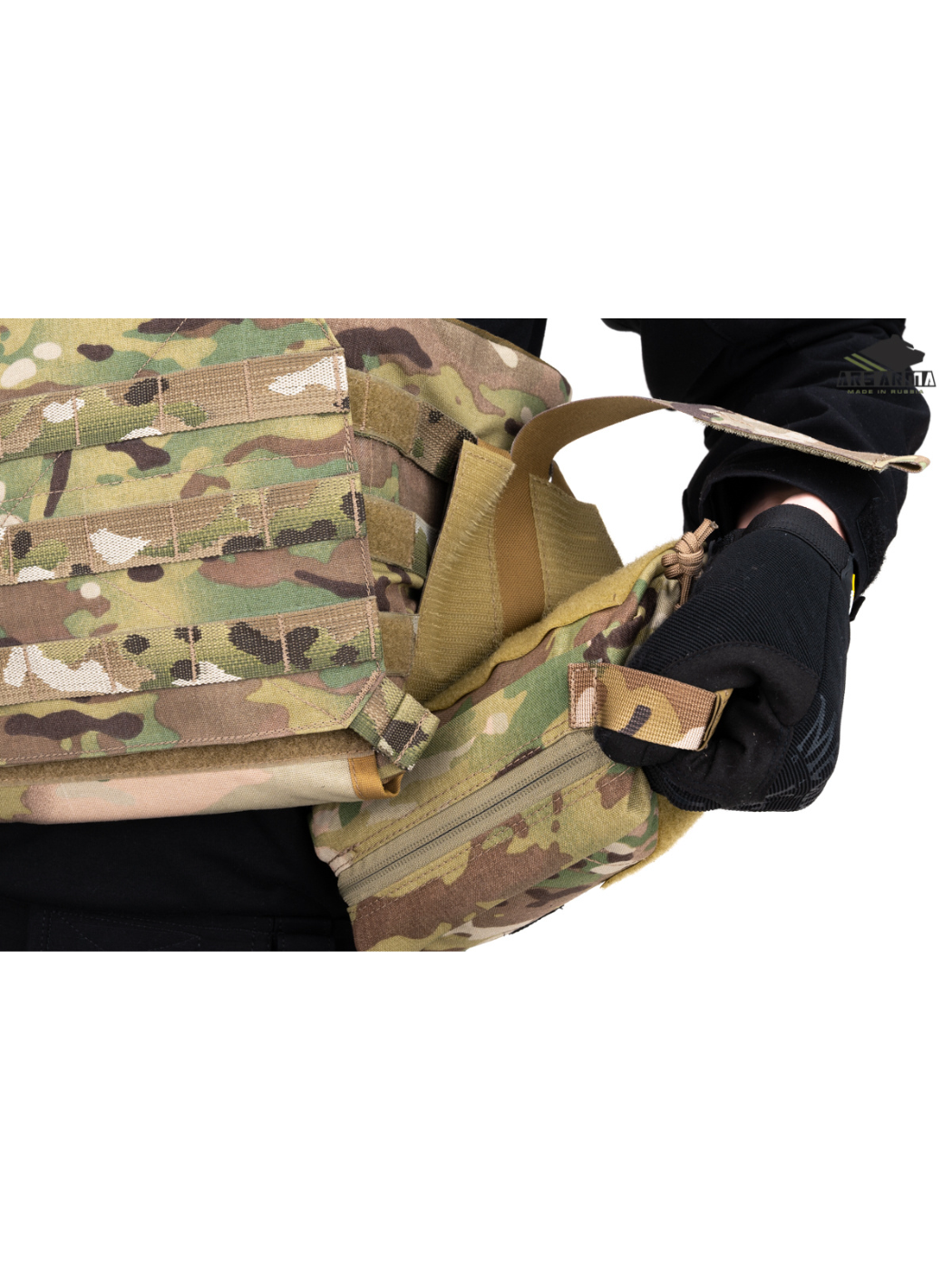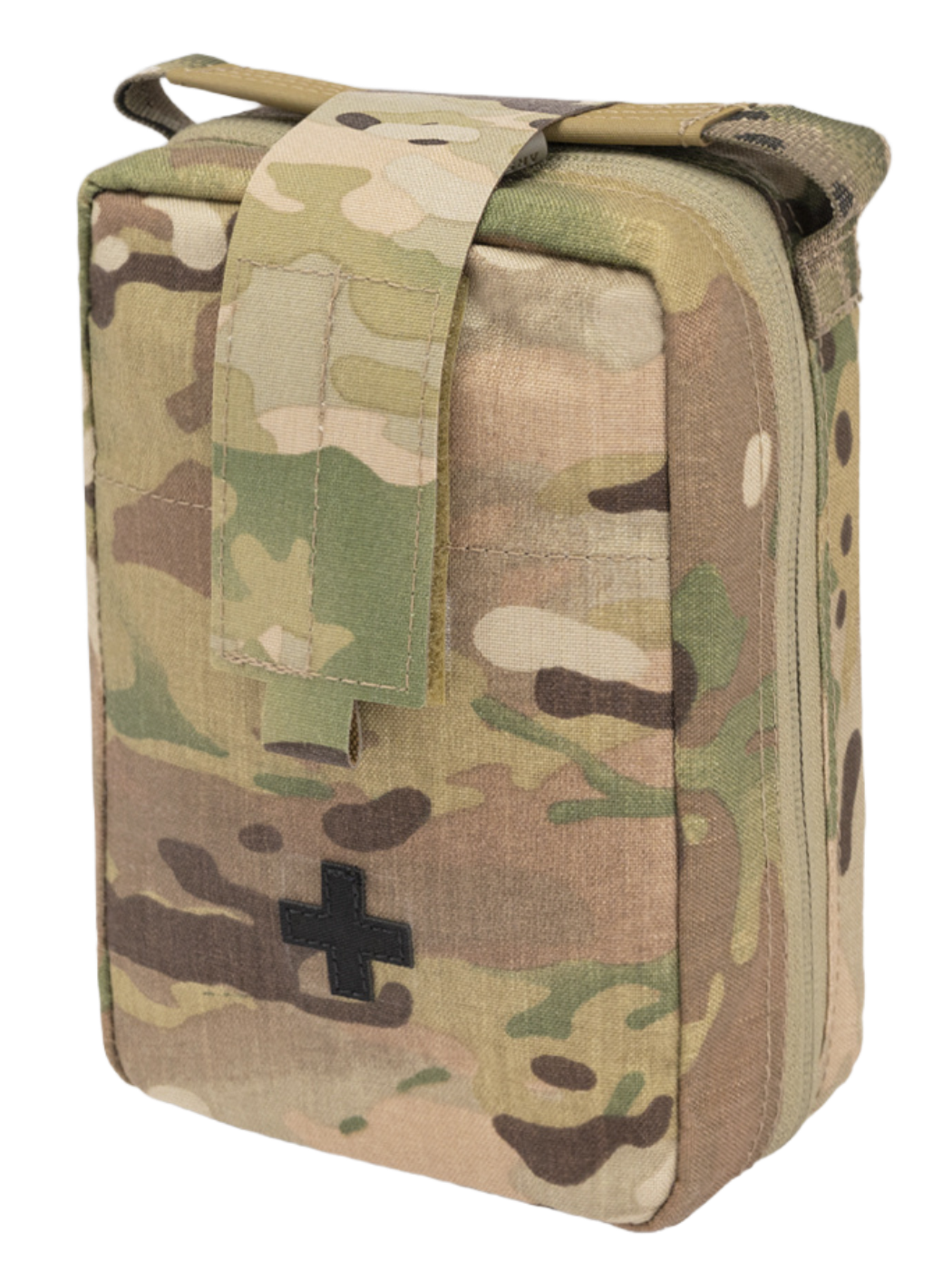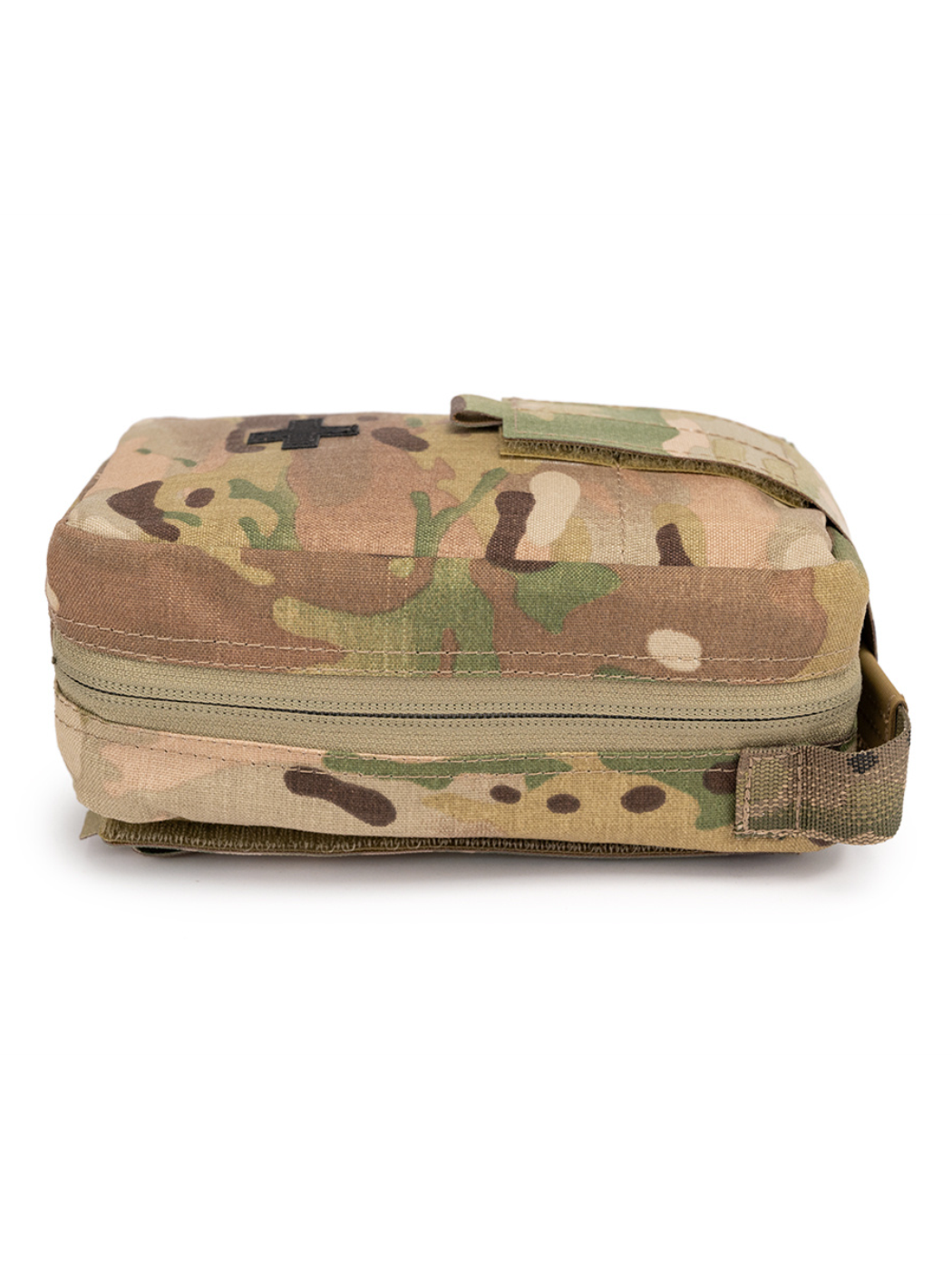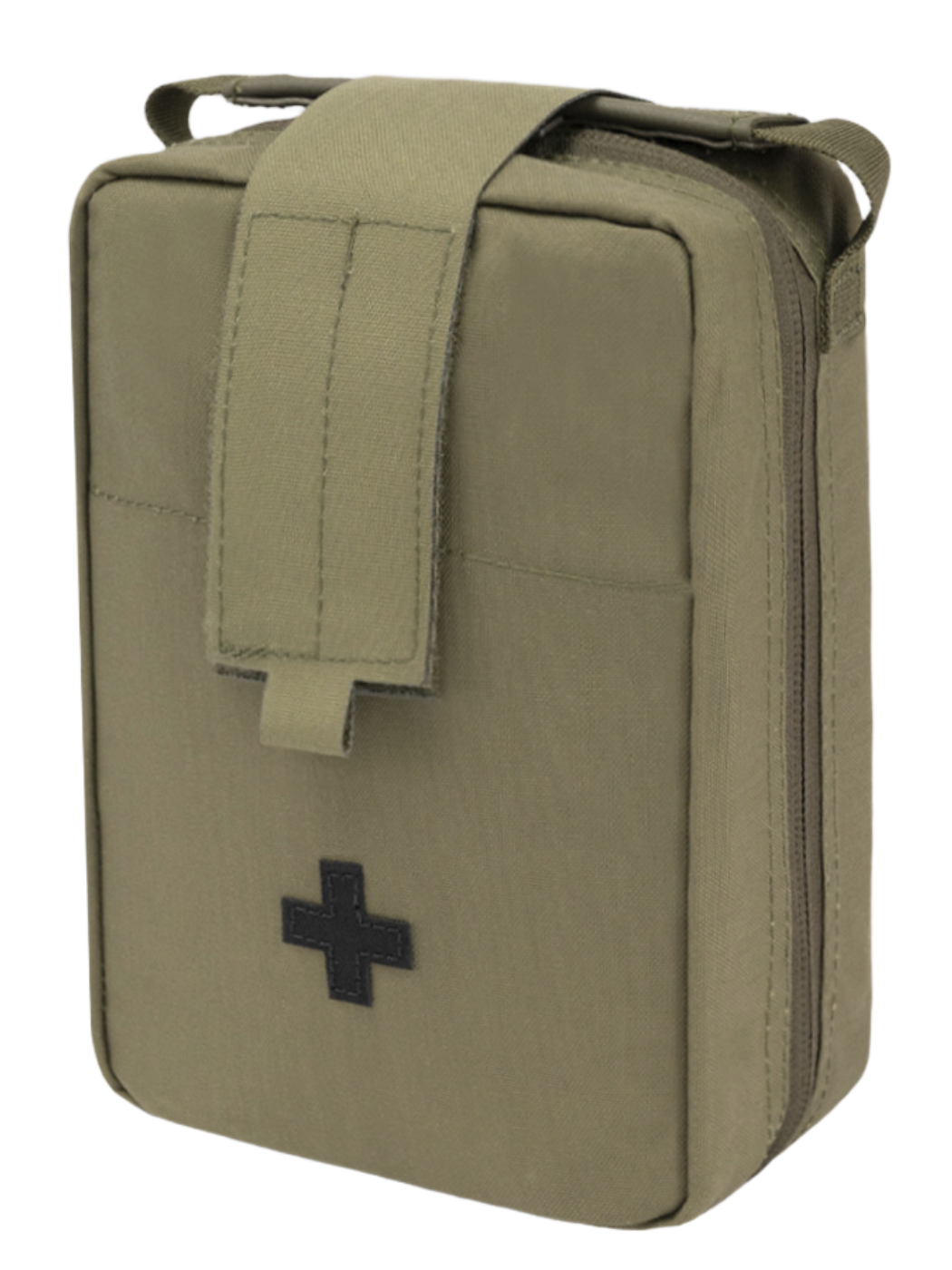 Малая отрывная аптека. Подсумок имеет очень удобный органайзер с эластичными карманами, стропами и петлями для крепления всего необходимого медицинского инвентаря. Подсумок состоит из площадки и подсумка, который крепится к ней с помощью велкро и удерживается хлястиком с велкро. Сверху находится ручка за которую подсумок тянут чтобы отделить от велкро площадки, также ее можно использовать для переноски подсумка отдельно от MOLLE платформ. Благодаря велкро площадке подсумок можно крепить на другие совместимые велкро платформы, например в медицинских рюкзаках.