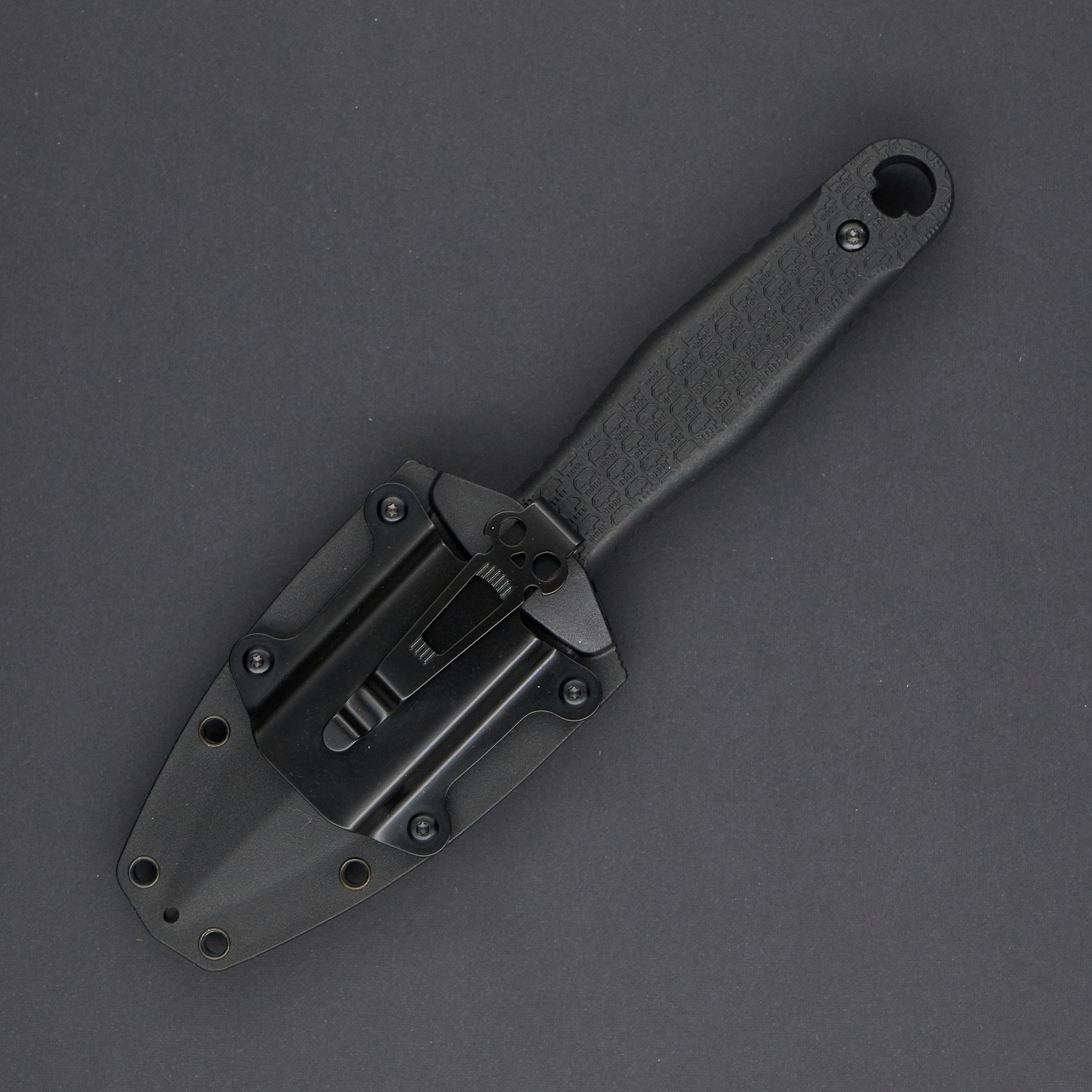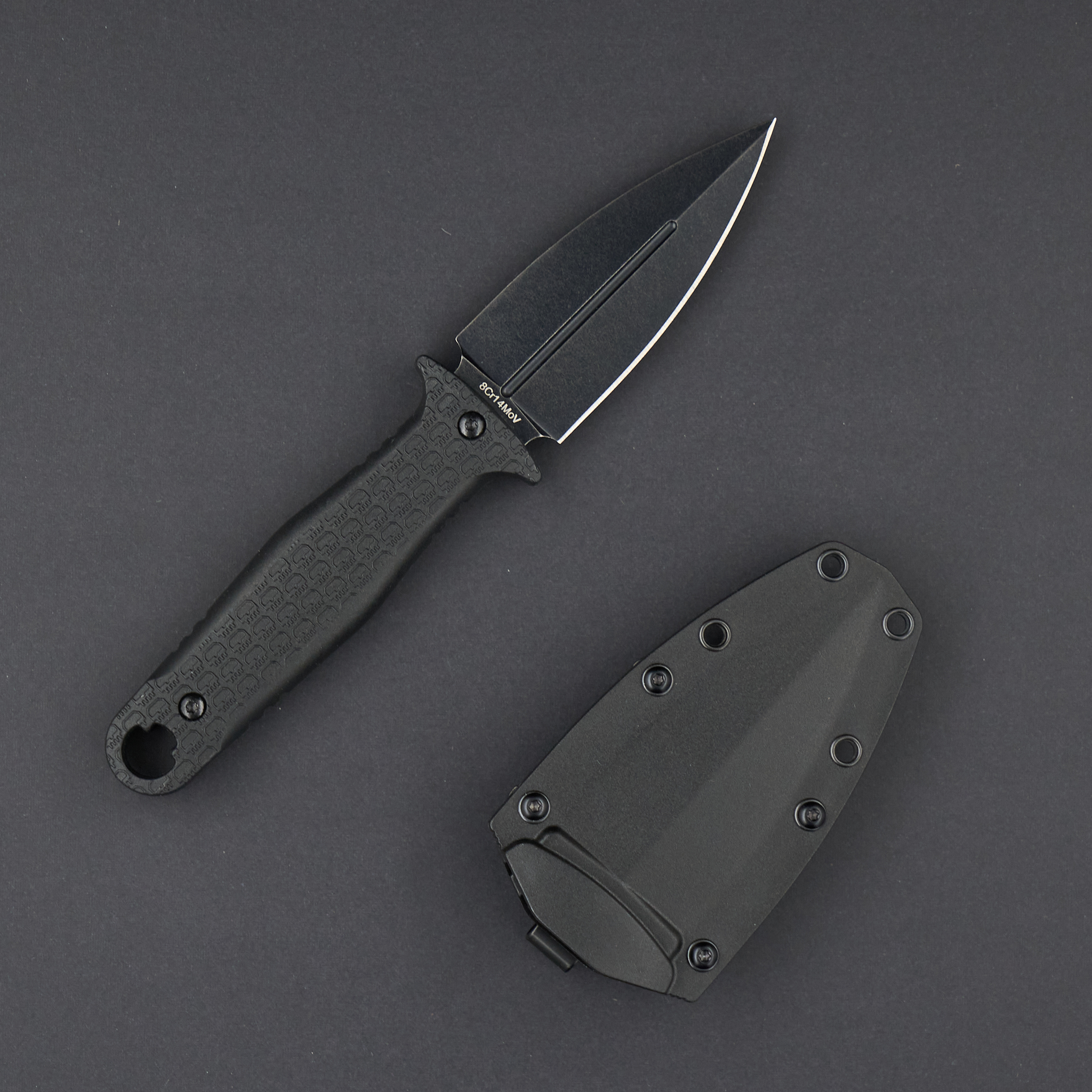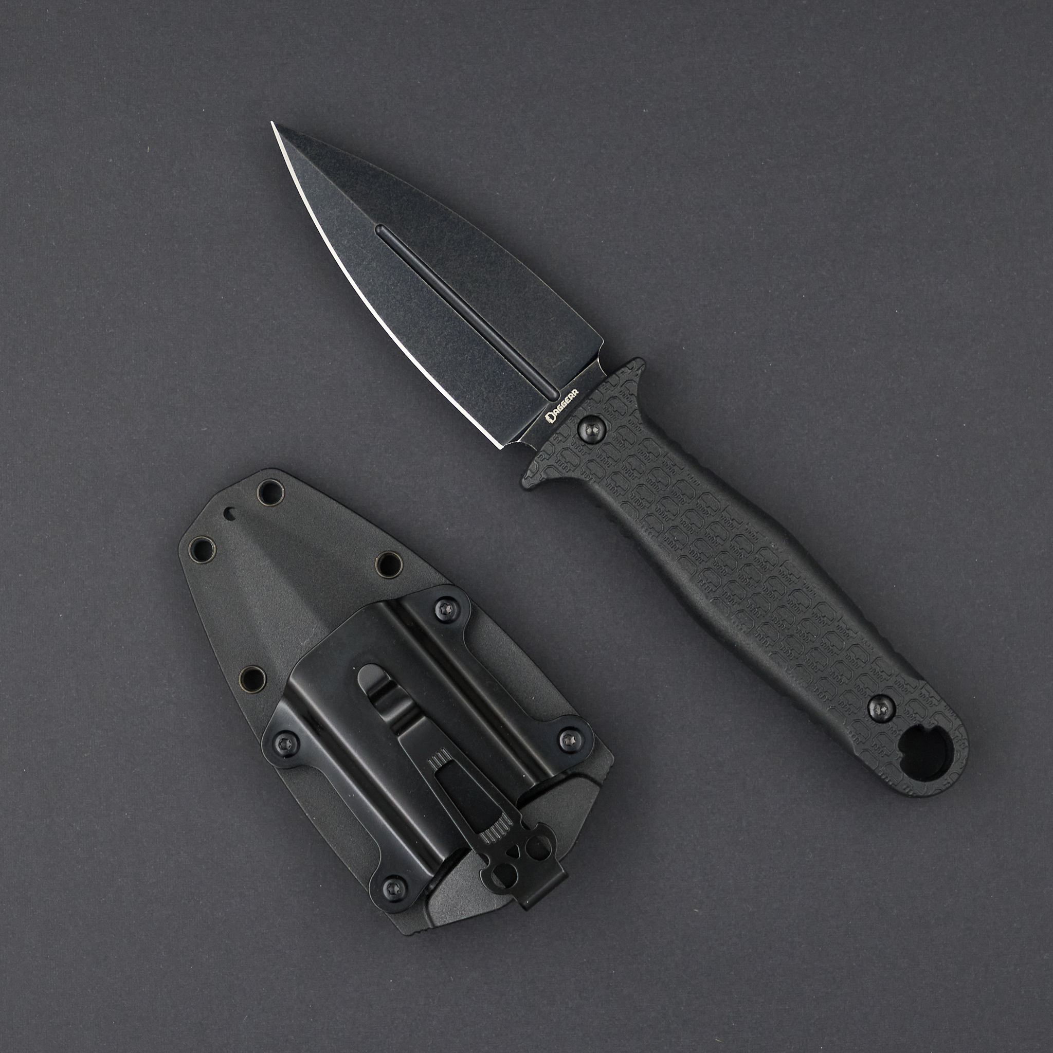 Рукоять из FRN с гардами гарантирует надежный хват, а отверстие для темляка выполнено в фирменном стиле Daggerr. Клинок из стали 8Cr14MoV устойчив к коррозии и сохраняет рабочие свойства при активной эксплуатации. Ножны оснащены клипсой, которая позволяет удобно носить нож на кармане.
