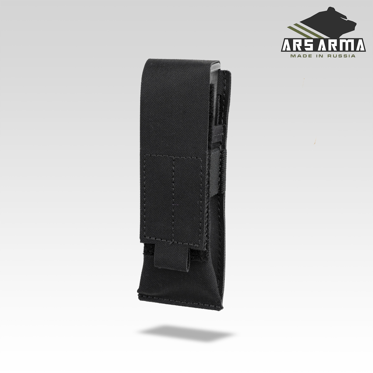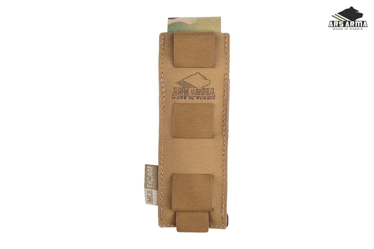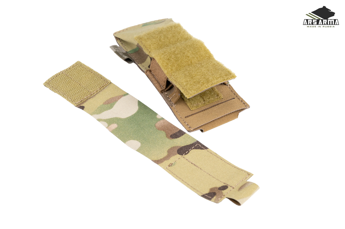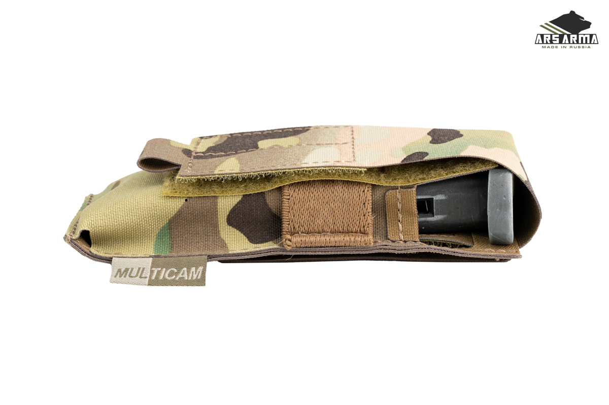Подсумок предназначен для переноски пистолетных магазинов, мультитула, фонаря. Фиксация содержимого осуществляется за счет регулируемого по высоте клапана с велкро, для лучшего удержания присутствует резинка, которая позволяет использовать подсумок с открытым клапаном для быстрого доступа к пистолетным магазинам.