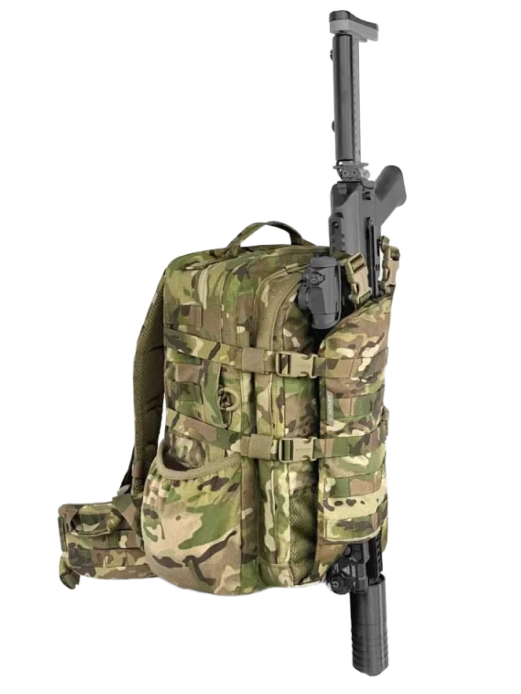 • Для вертикального крепления оружия и длинномерных предметов диаметром до 7 см, под клапаном выполнено отверстие. Также на передней стенке кармана нашито два вертикальных ремня с четырьмя ячейками по 3 см на каждом, в которые вставляются съёмные петли.