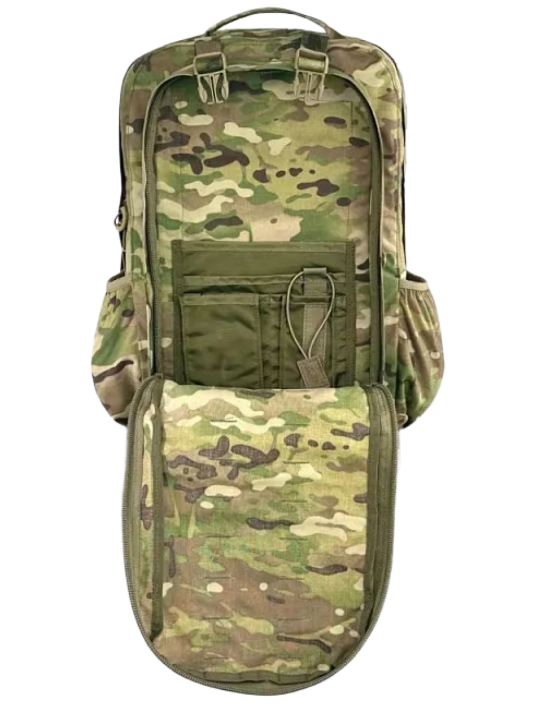 • На дне основного отделения расположены две ременные ленты по 8 ячеек Molle на каждой.