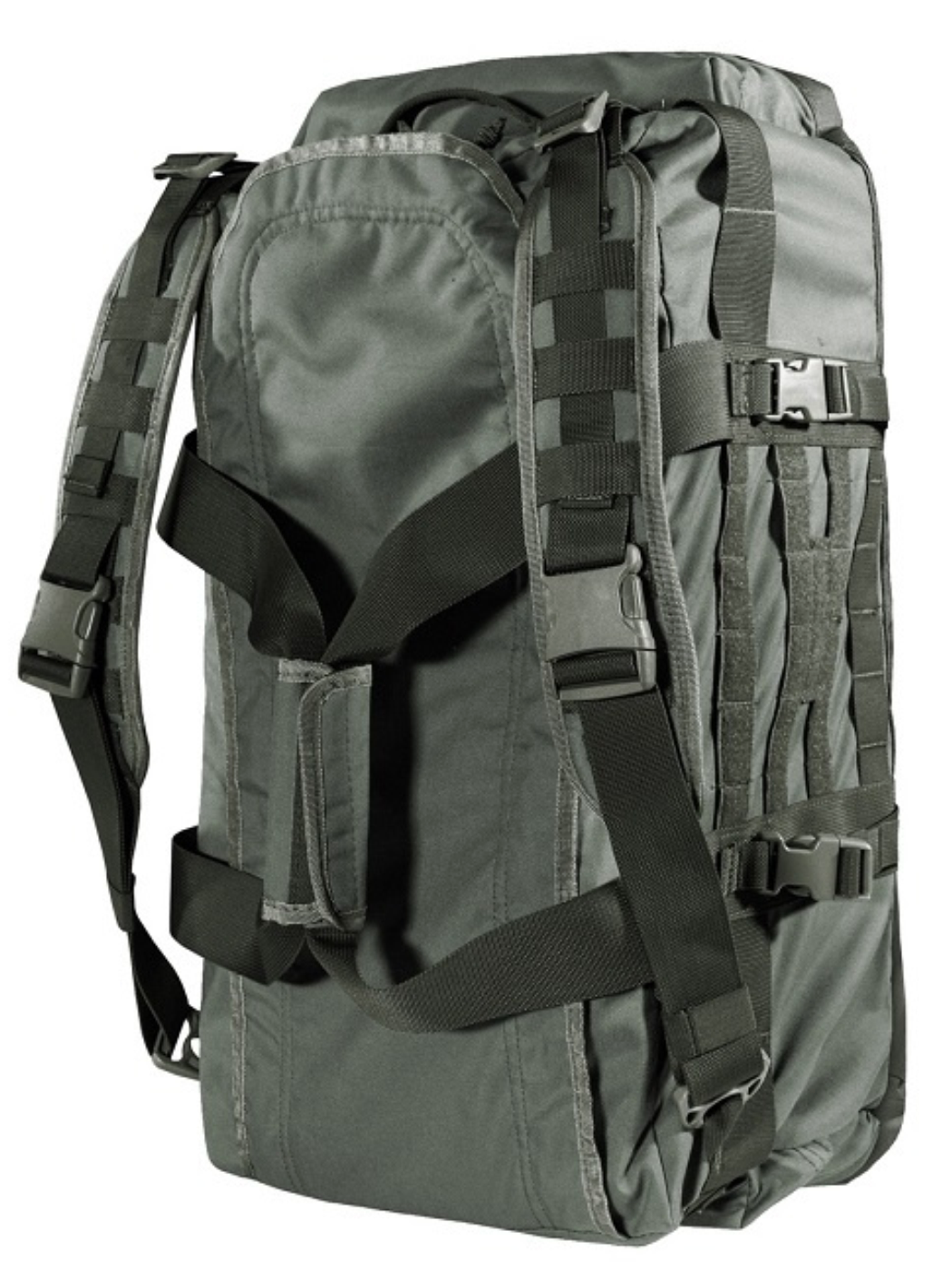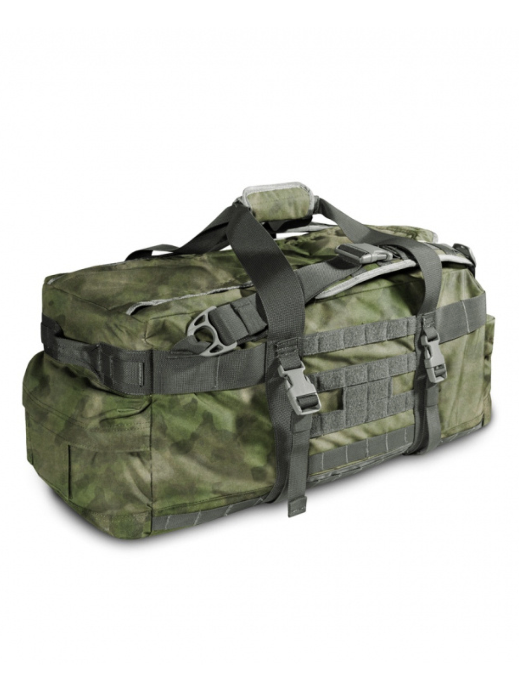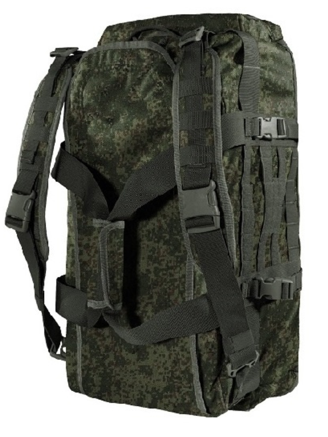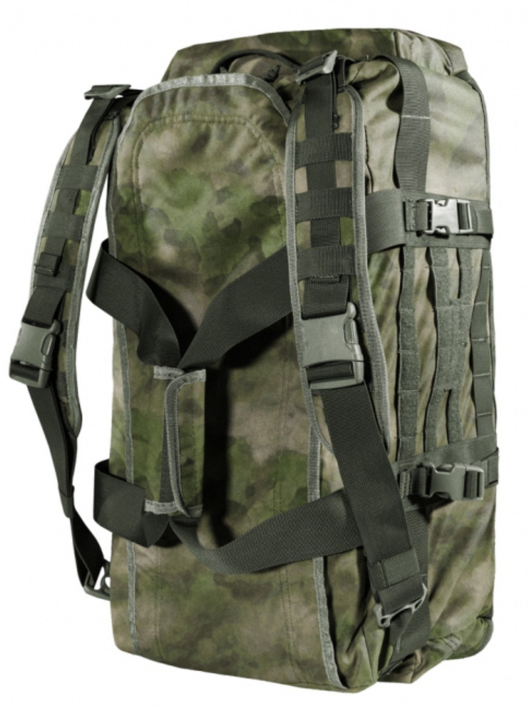 Регулируемые рюкзачные лямки с мягким сетчатым подкладом и стропами MOLLE / PALS имеют систему быстрого сброса на фастексах и позволяют носить сумку, как рюкзак. Боковые стропы-ремни с фастексами могут служить, как компрессионные ремни или для закрепления снаружи сумки объёмных предметов - карематов, палатки, тёплой куртки и т.п.