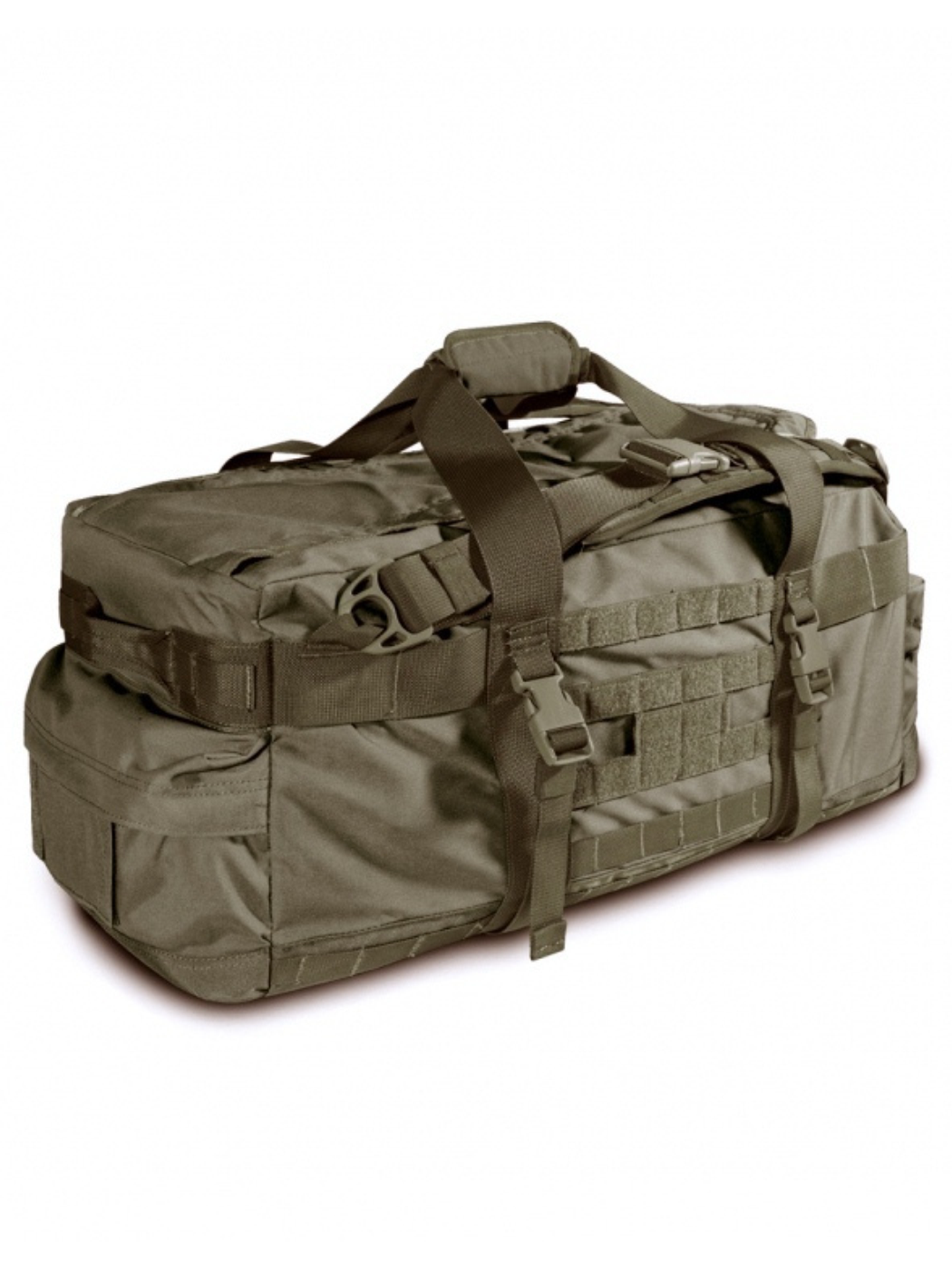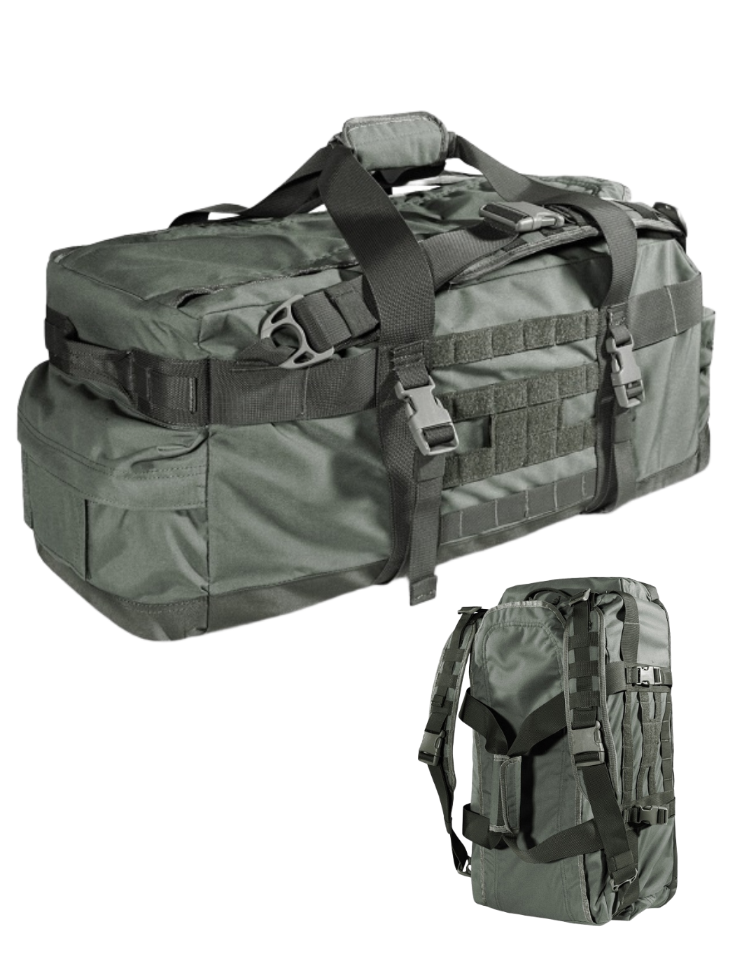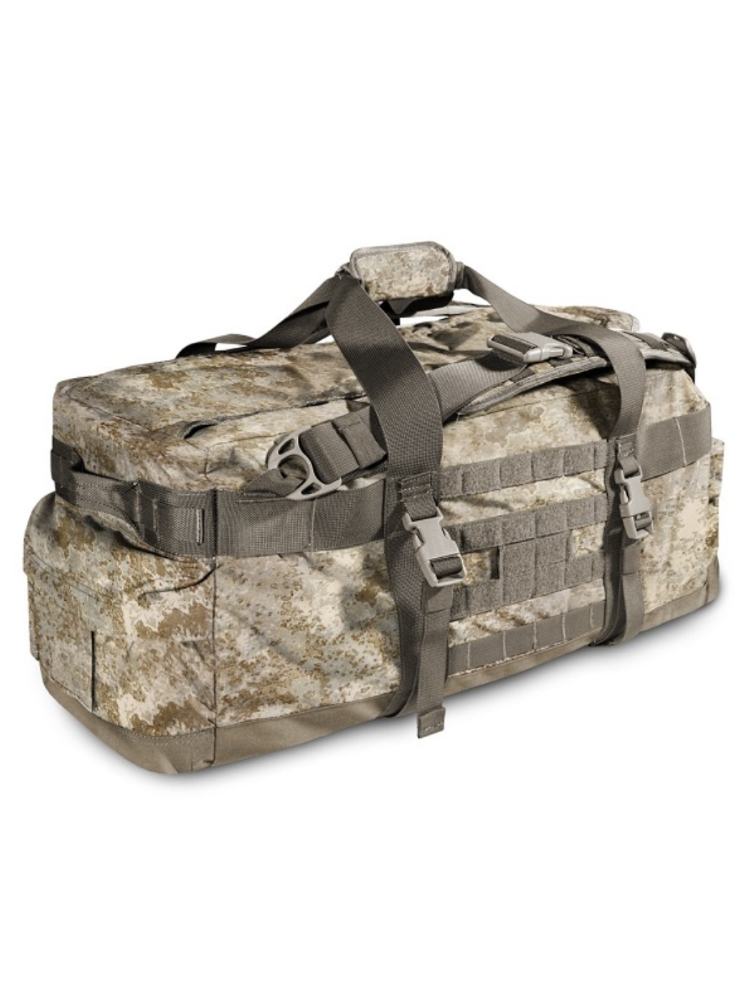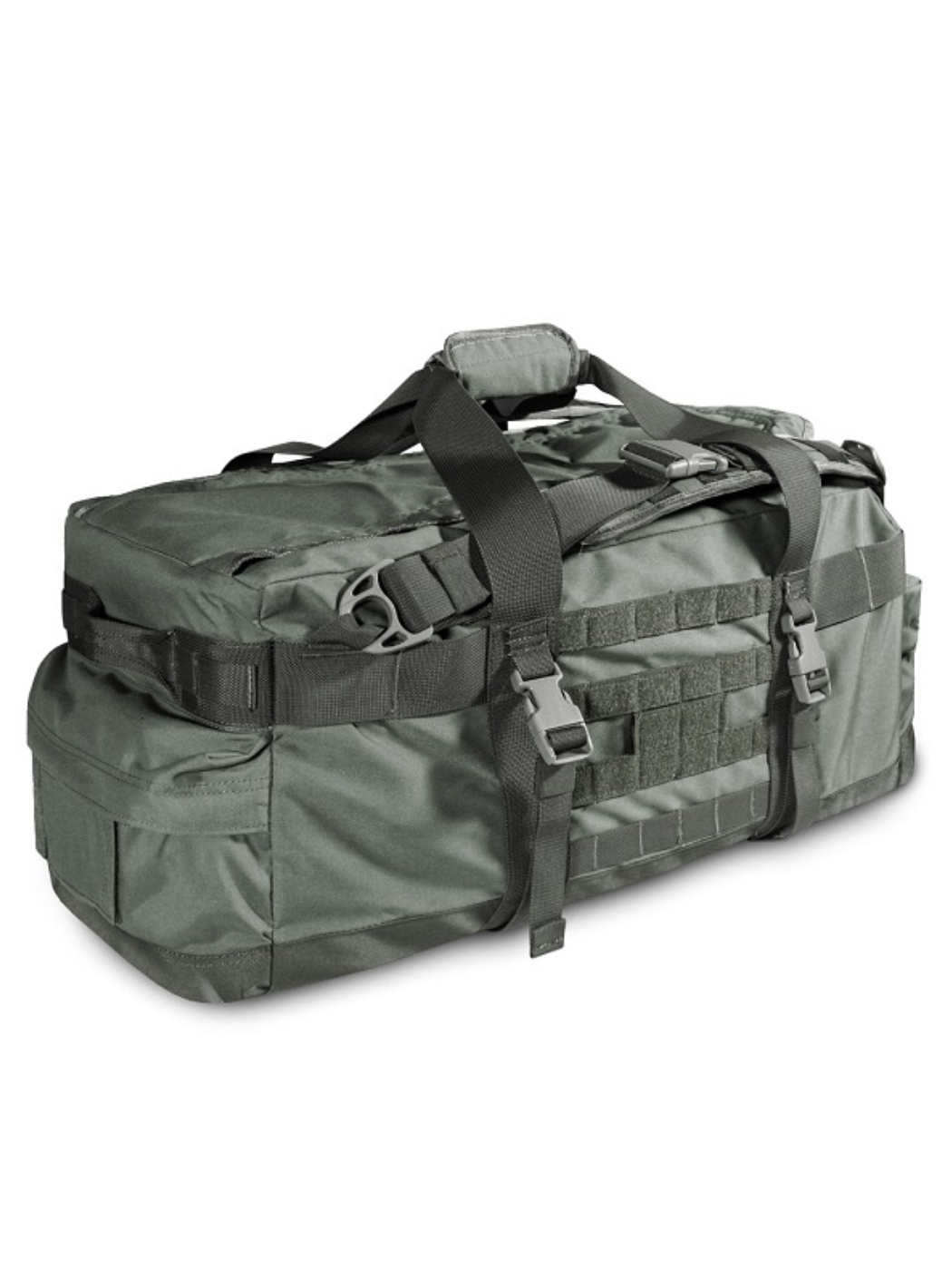 Регулируемые рюкзачные лямки с мягким сетчатым подкладом и стропами MOLLE / PALS имеют систему быстрого сброса на фастексах и позволяют носить сумку, как рюкзак. Боковые стропы-ремни с фастексами могут служить, как компрессионные ремни или для закрепления снаружи сумки объёмных предметов - карематов, палатки, тёплой куртки и т.п.