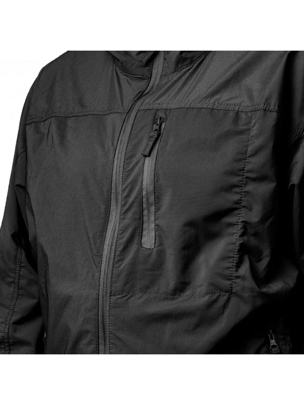 Эластичная окантовка по низу куртки, на манжетах эффективно защищает от ветра. Капюшон подрезинен по бокам овала лица и на затылке. Ветровка имеет два боковых кармана и один нагрудный на молниях.