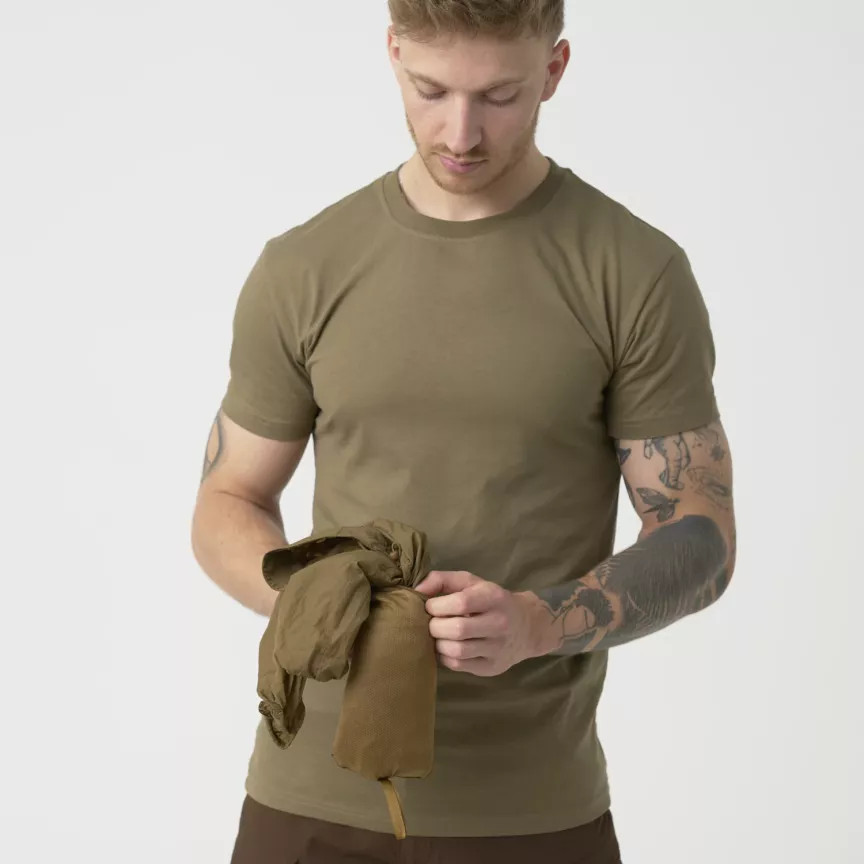 Система самостоятельной упаковки. В сложенном виде куртка помещается в собственный нагрудный карман, который также служит чехлом для хранения. В таком виде она занимает минимум места и легко помещается в рюкзак, сумку или даже карман брюк.