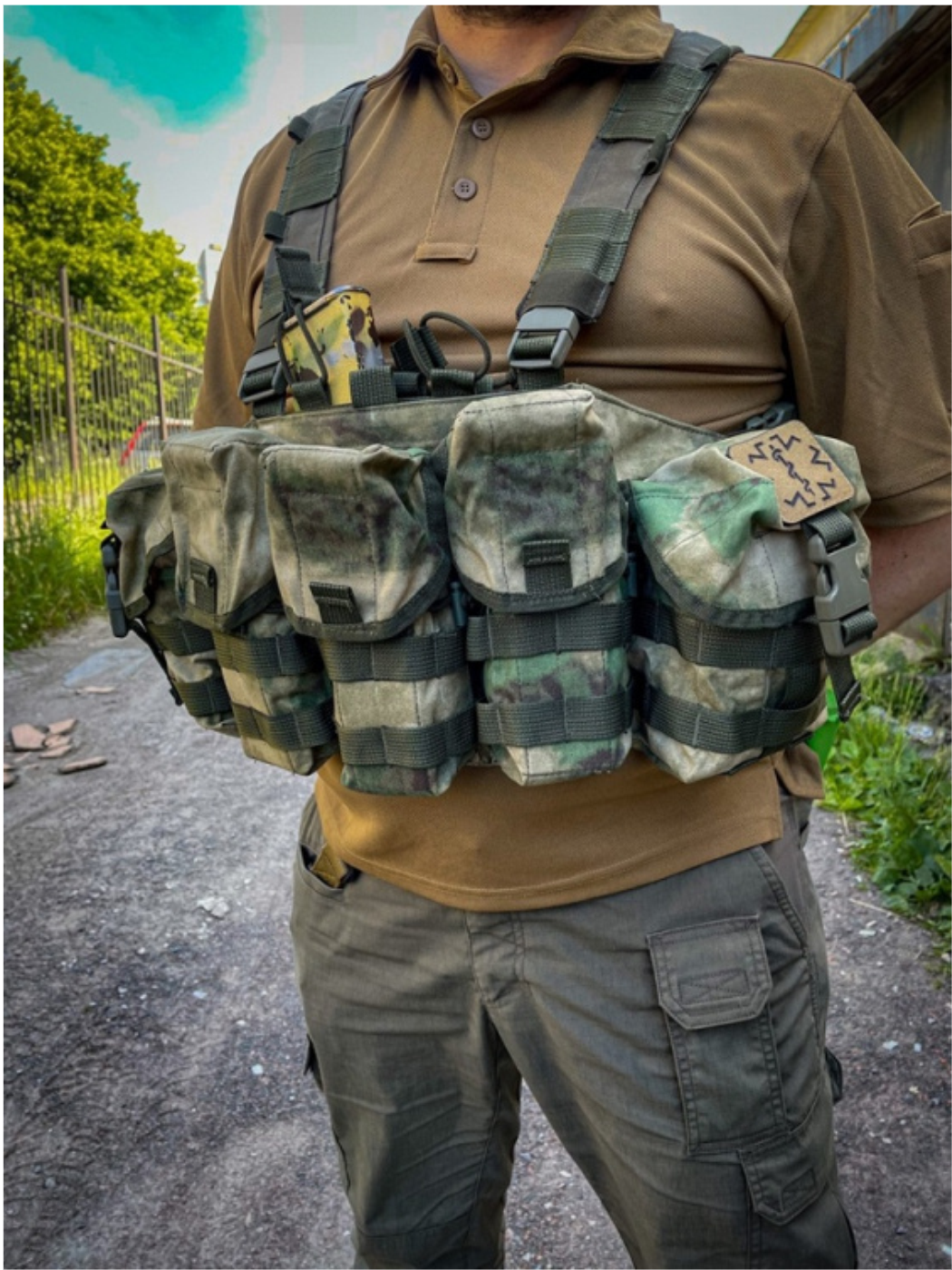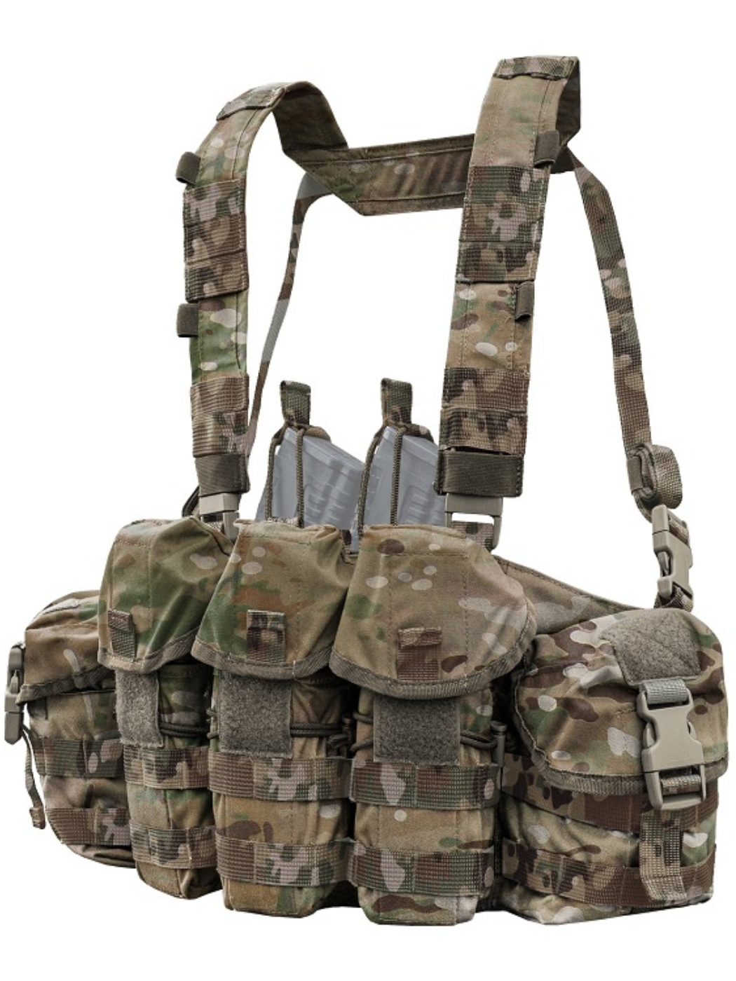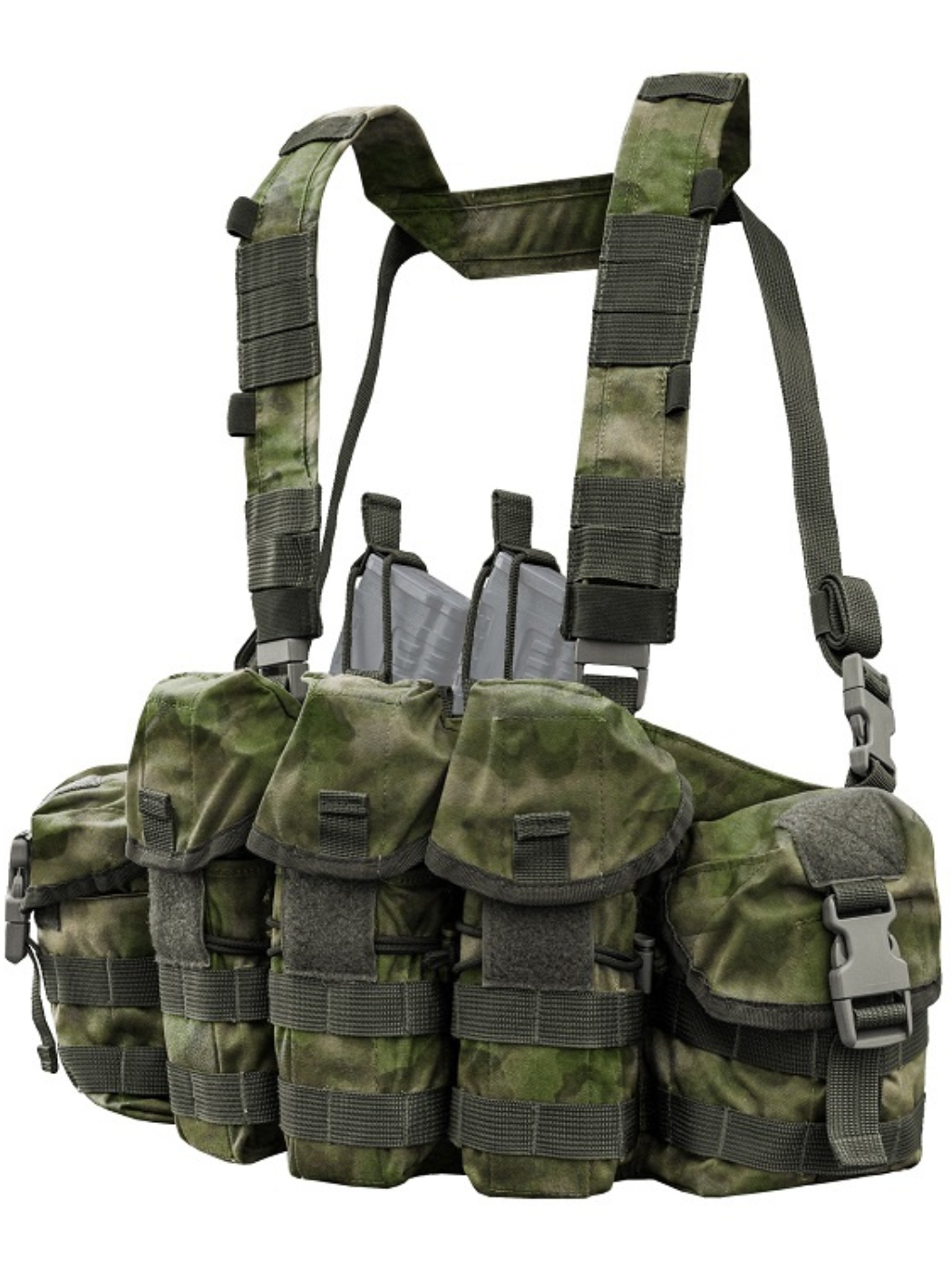 - Два универсальных грузовых подсумка на боковых частях Chest Rig закрываются клапанами на пряжках фастекс и велкро.