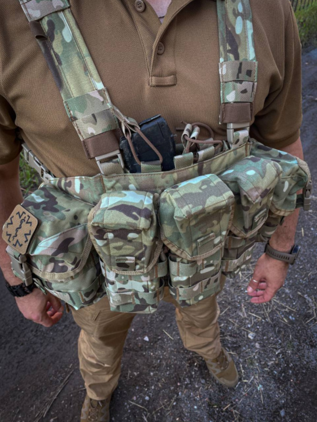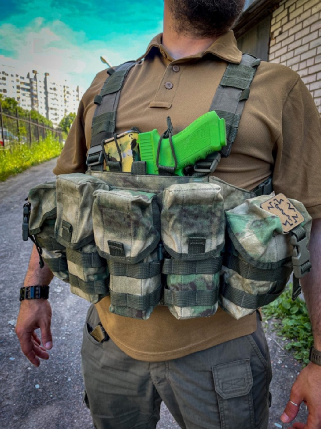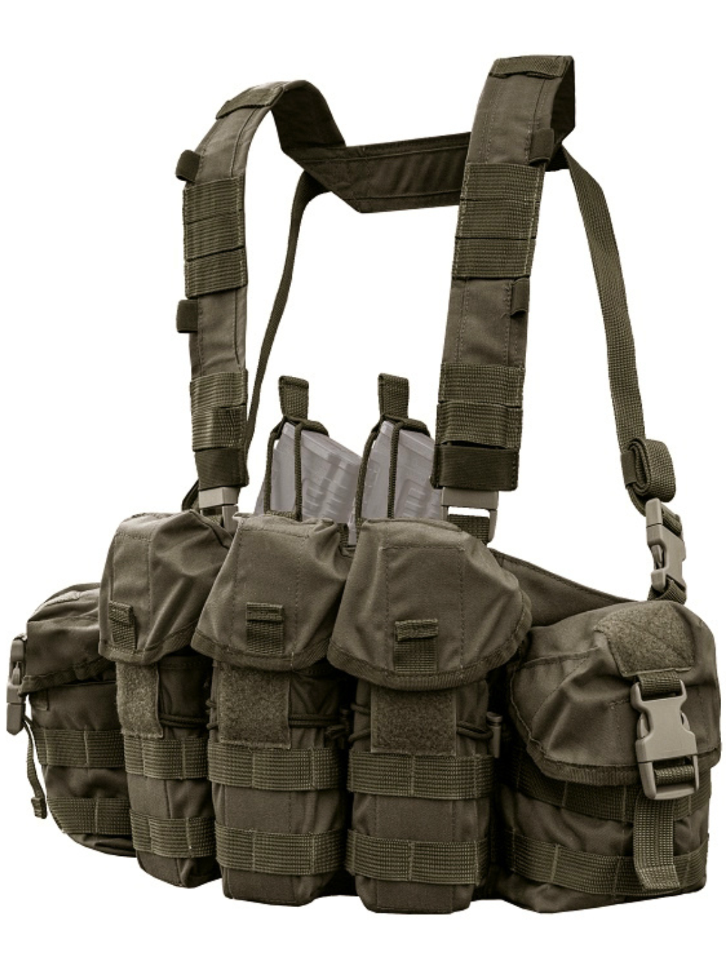 - Два универсальных грузовых подсумка на боковых частях Chest Rig закрываются клапанами на пряжках фастекс и велкро.